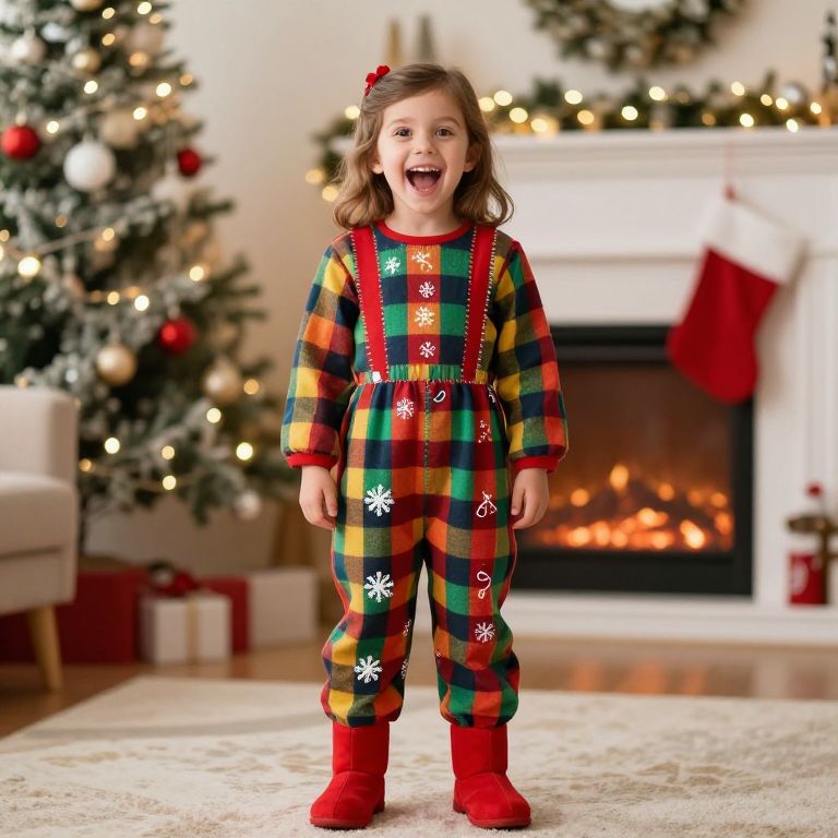 A family portrait showing a girl in a homemade Christmas outfit — a colorful plaid jumpsuit with embroidered snowflakes and red boots — standing in front of a decorated living room with a fireplace and twinkling lights, her face bright and full of excitement, the outfit clearly handmade with visible stitching and fabric folds