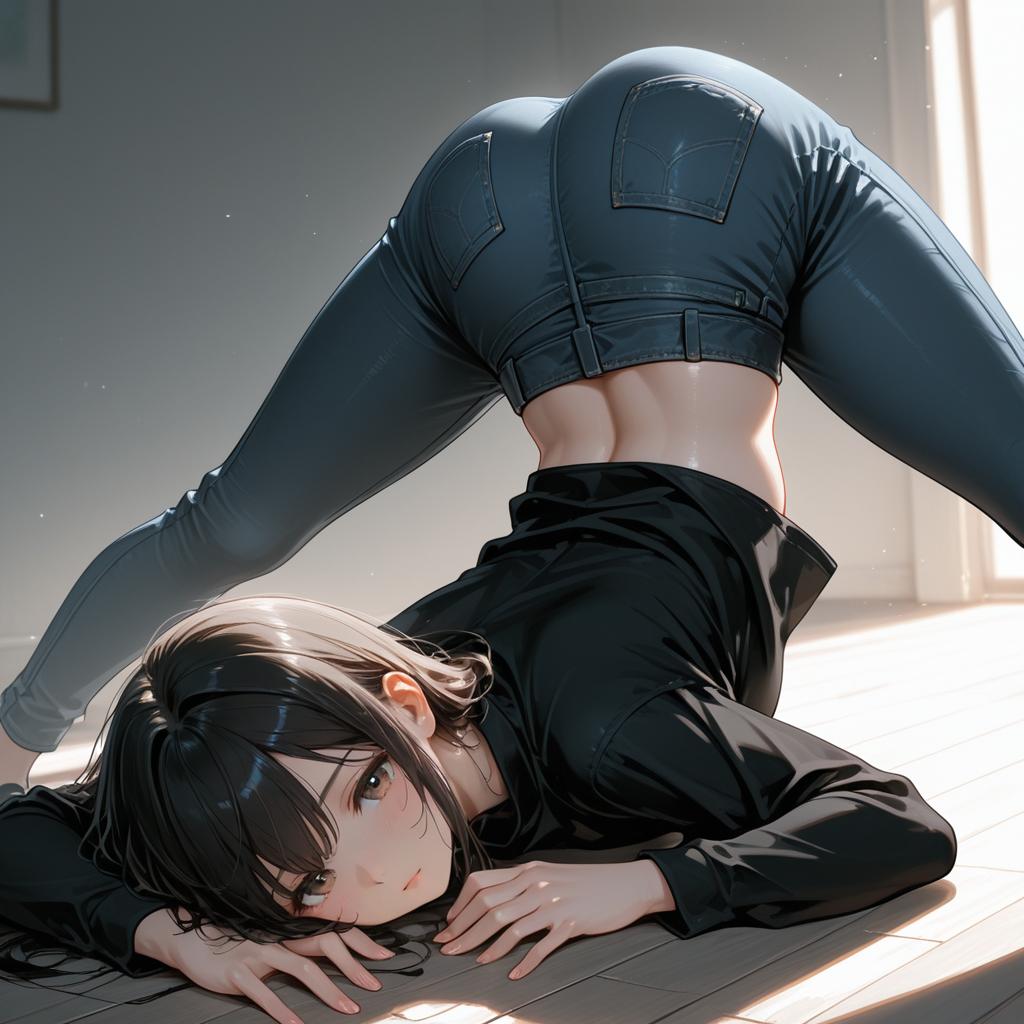Beautiful, masterpiece, best quality, extremely detailed face, perfect lighting, 1girl, solo, jack-o' challenge, flexible, spread legs, top-down bottom-up, pants, black shirt