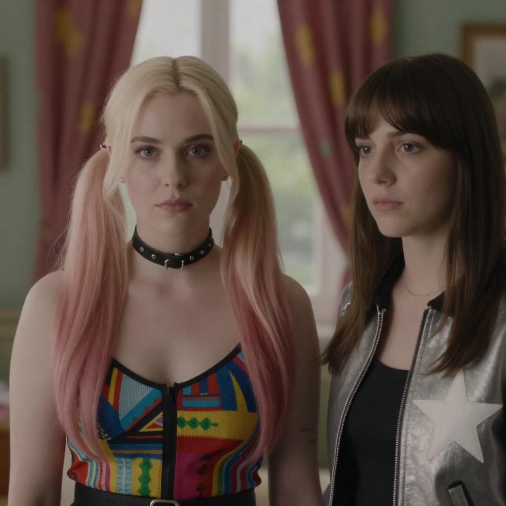Photograph of two women in a room. Blonde woman with pink pigtails, black choker, colorful patterned top, serious expression. Brown-haired woman with bangs, metallic jacket, white star, looking to the side. Background: colorful curtains, window with greenery.