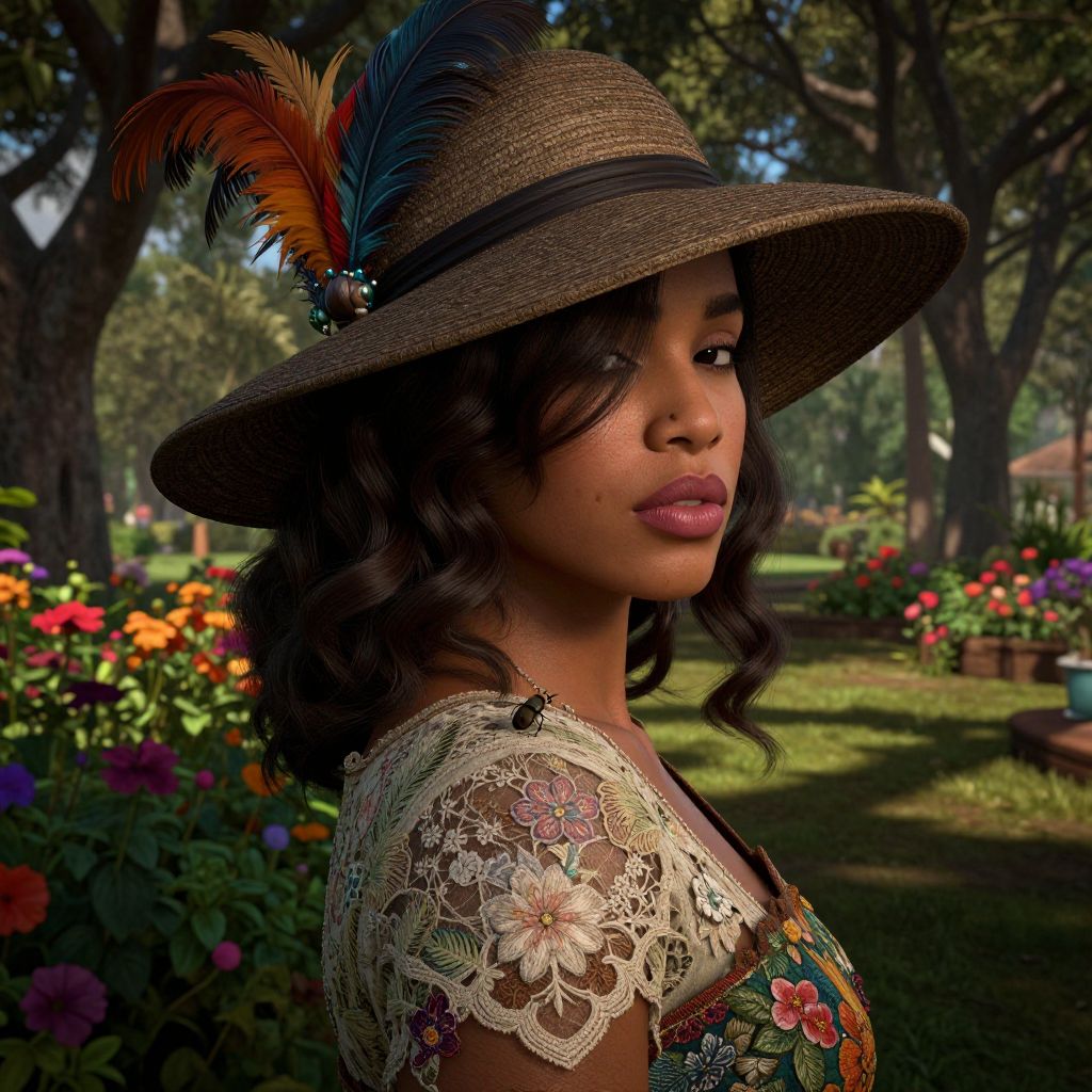 Create a photorealistic digital portrait that captures intricate details in a close-up of a Caribbean woman with a beauty mark near her full lips. Enhance the sense of mystery with dark, wavy hair falling over one eye, partially concealed under a wide-brimmed hat adorned with colorful feathers. From the unique perspective of a tiny insect on her shoulder, emphasize the rich textures of her vintage lace dress, featuring delicate floral embroidery. Set this portrait against the lush backdrop of a garden, creating an emotional gradient with vibrant flower colors and shadows cast by tall trees, evoking a sense of serenity and enchantment in this captivating, photorealistic scene.