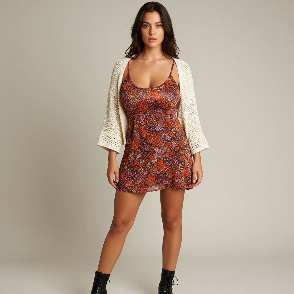 "Woman, bohemian, floral print mini dress in orange, pink, and dark hues, scoop neck, thin straps, loose-fitting, cream crochet knit cardigan, three-quarter length sleeves, black ankle boots with lace-up front, plain backdrop.. Sexy. Pretty face and beаutiful eyes. Big breasts."