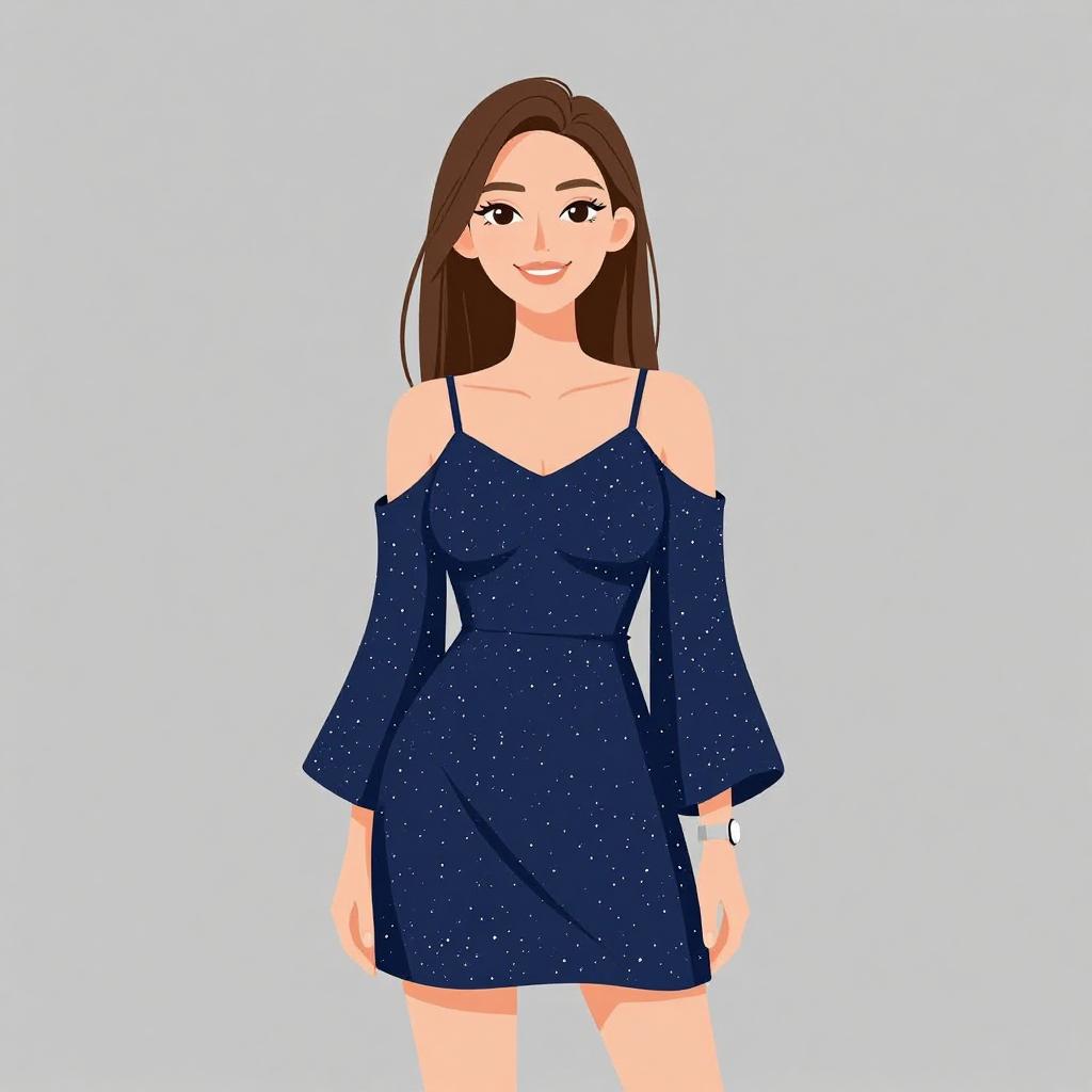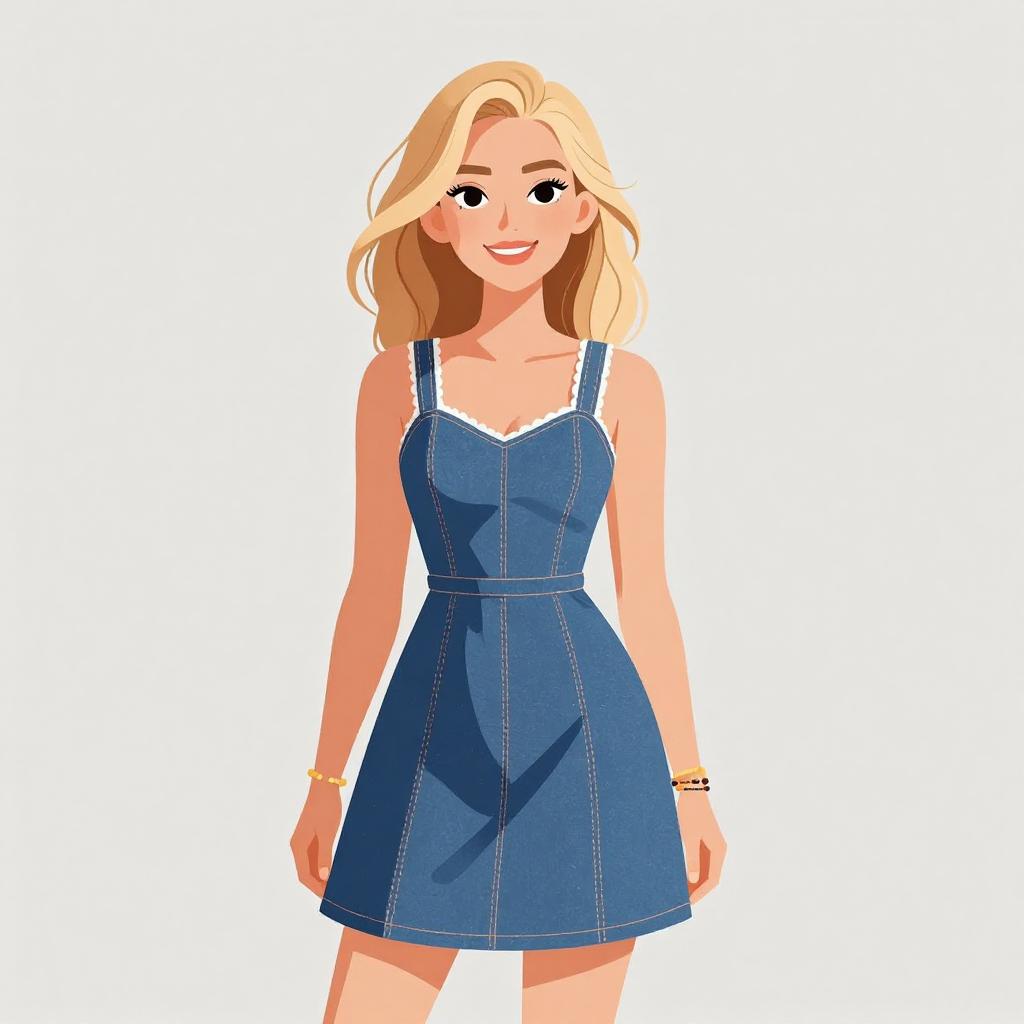 Digital illustration of a smiling blonde woman with fair skin, wearing a sleeveless, knee-length, blue denim dress with white trim. She has straight, shoulder-length hair and is accessorized with a gold bracelet on her right wrist. Her black eyes are slightly squinted, giving her a cheerful expression. The background is plain white, making her the focal point. The art style is colorful and cartoonish, with clean lines and a slightly exaggerated, cheerful aesthetic.