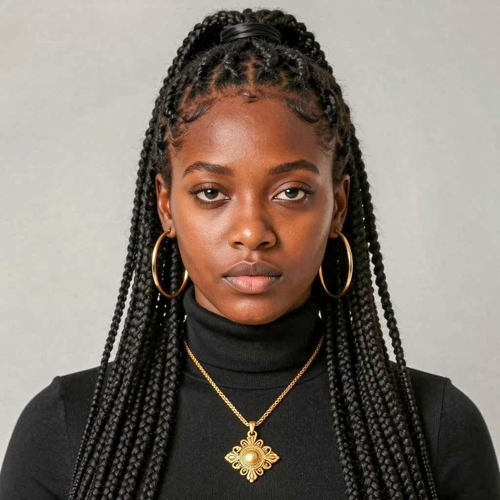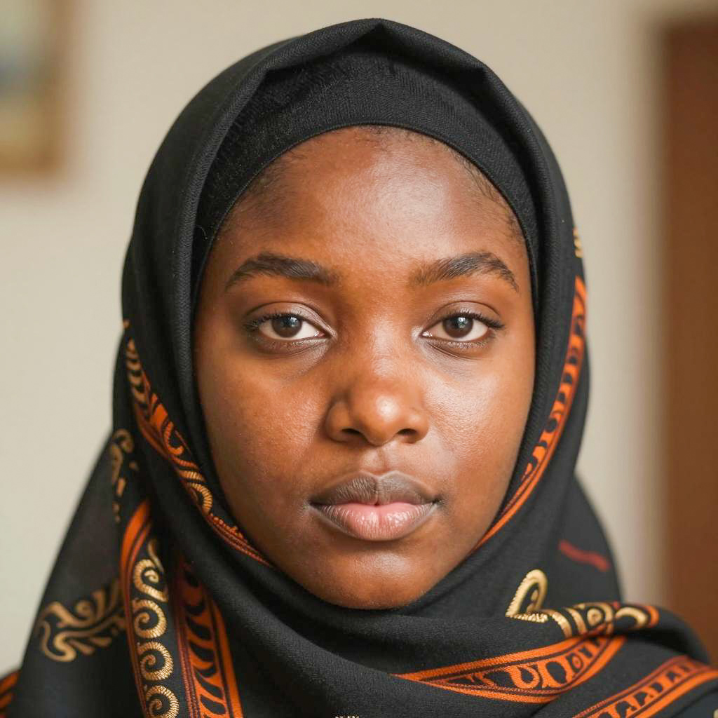 Close-up portrait of a dark-skinned woman wearing a black hijab adorned with subtle sparkles. She has brown eyes, full lips, and prominent black eyeliner. The woman wears a large, intricate silver earring on her right ear. The background features softly blurred architectural columns, enhancing the focus on her thoughtful expression and detailed facial features.