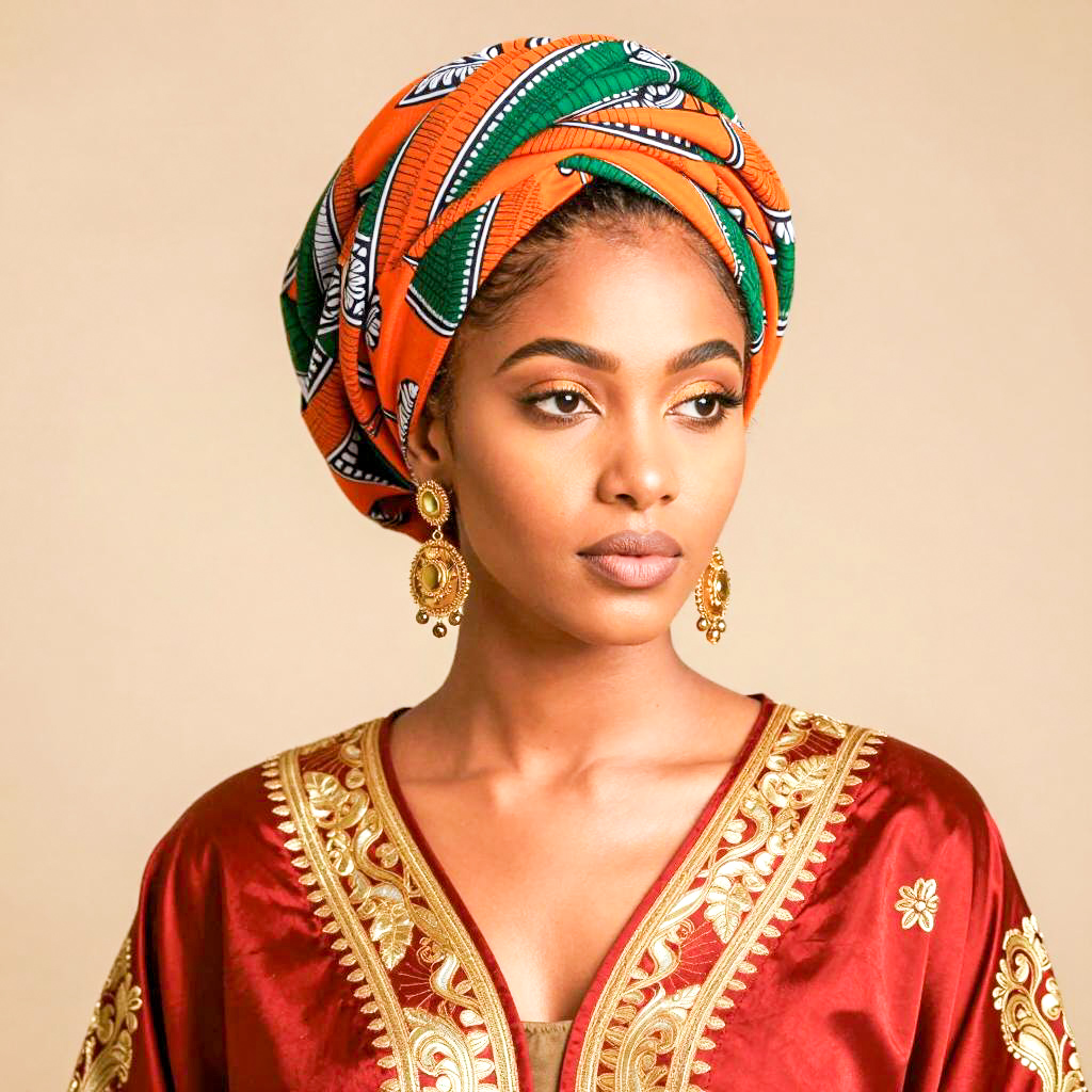 Close-up photograph of a dark-skinned woman with brown eyes, full lips, and black hijab. She wears a large, intricate silver earring on her right ear. Her makeup includes black eyeliner and light blush. She looks to the left. Background features blurred architectural elements. Her hijab has subtle sparkles.