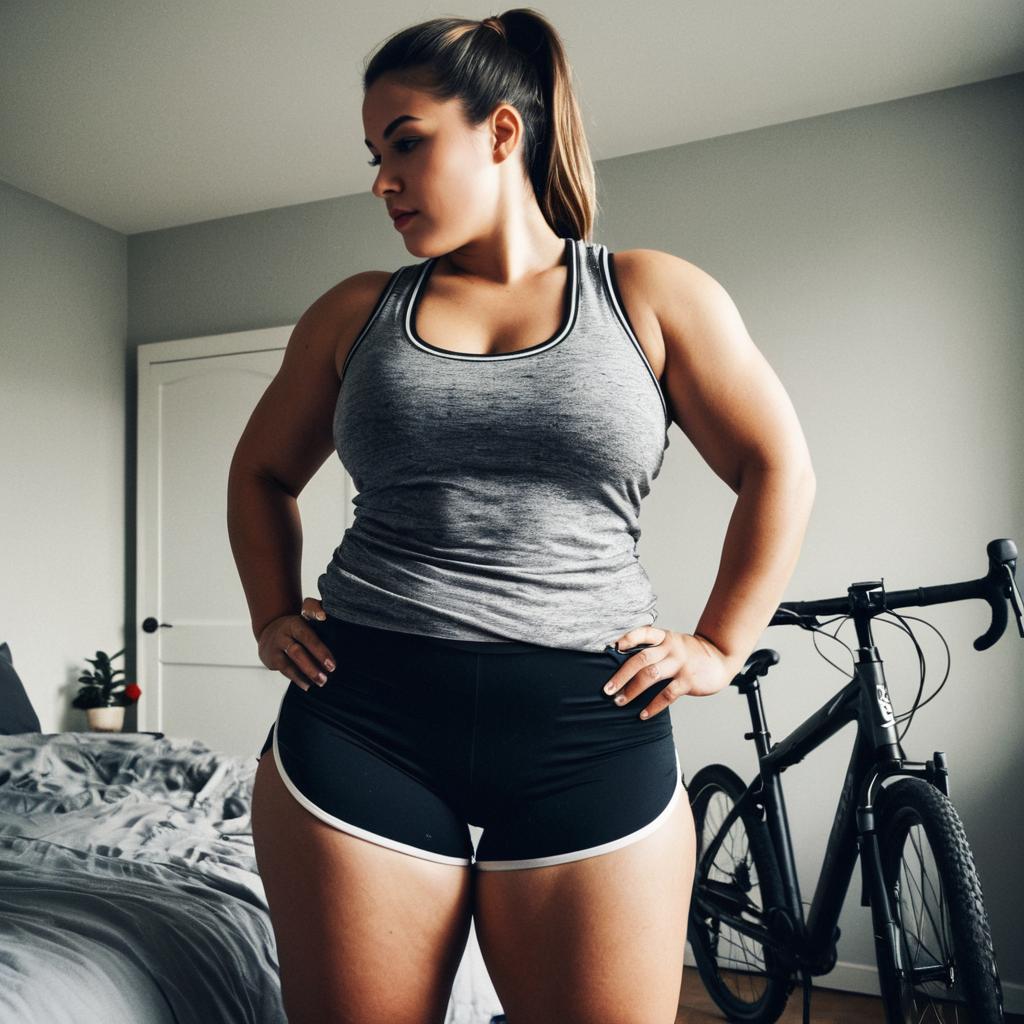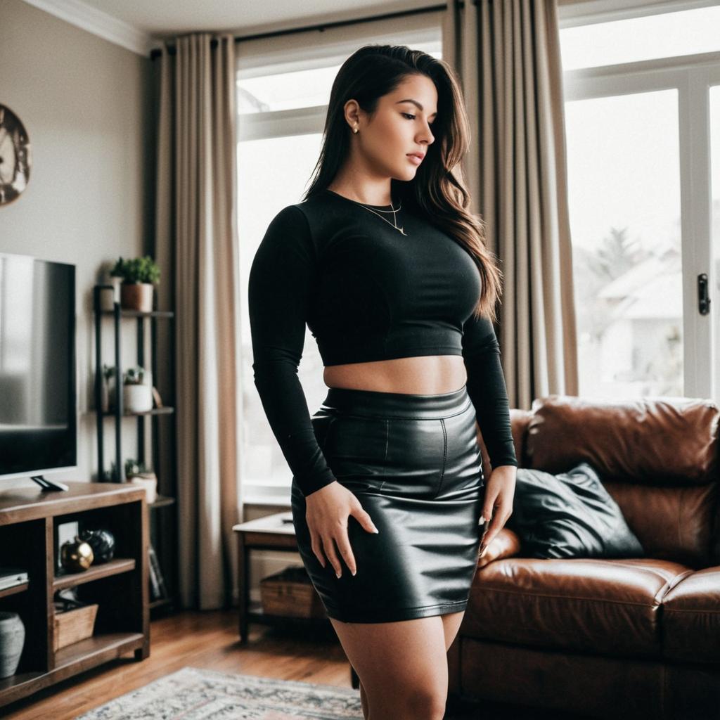 Scene of a timid, gorgeous fitness girl with an hourglass figure, wearing a fitted long-sleeve crop top and leather skirt, standing in a feminine pose from an angle in her living room. Emphasizes her chubby hips and graceful posture