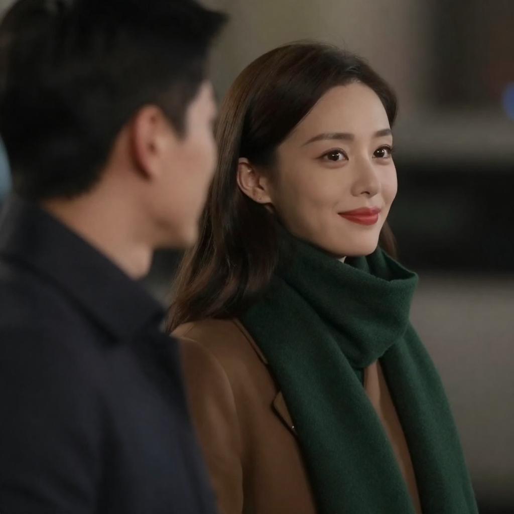 Photograph of a woman with fair skin, straight brown hair, and red lipstick, wearing a dark green scarf and brown coat, looking to her right with a slight smile. A man with short dark hair, seen from the back, is in the foreground. The background is blurred, suggesting an outdoor nighttime setting.