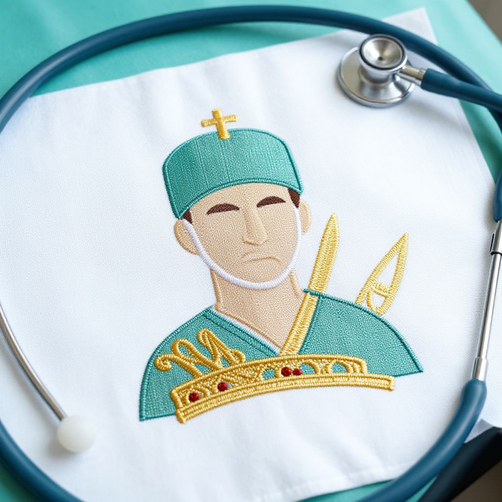 Photograph of a colored embroidery on white fabric, depicting a male surgeon with light skin and closed eyes, wearing a teal surgical cap and matching teal scrubs. He has a gold crown with red jewels embroidered on his chest, and a gold surgical scalpel crossed behind his shoulders. The embroidery is held by a silver stethoscope with a black rubber earpiece, placed in the top right corner. The background is a blurred, light blue surface. The image focuses on the embroidery, highlighting the detailed, textured stitching of the surgeon's attire and accessories.