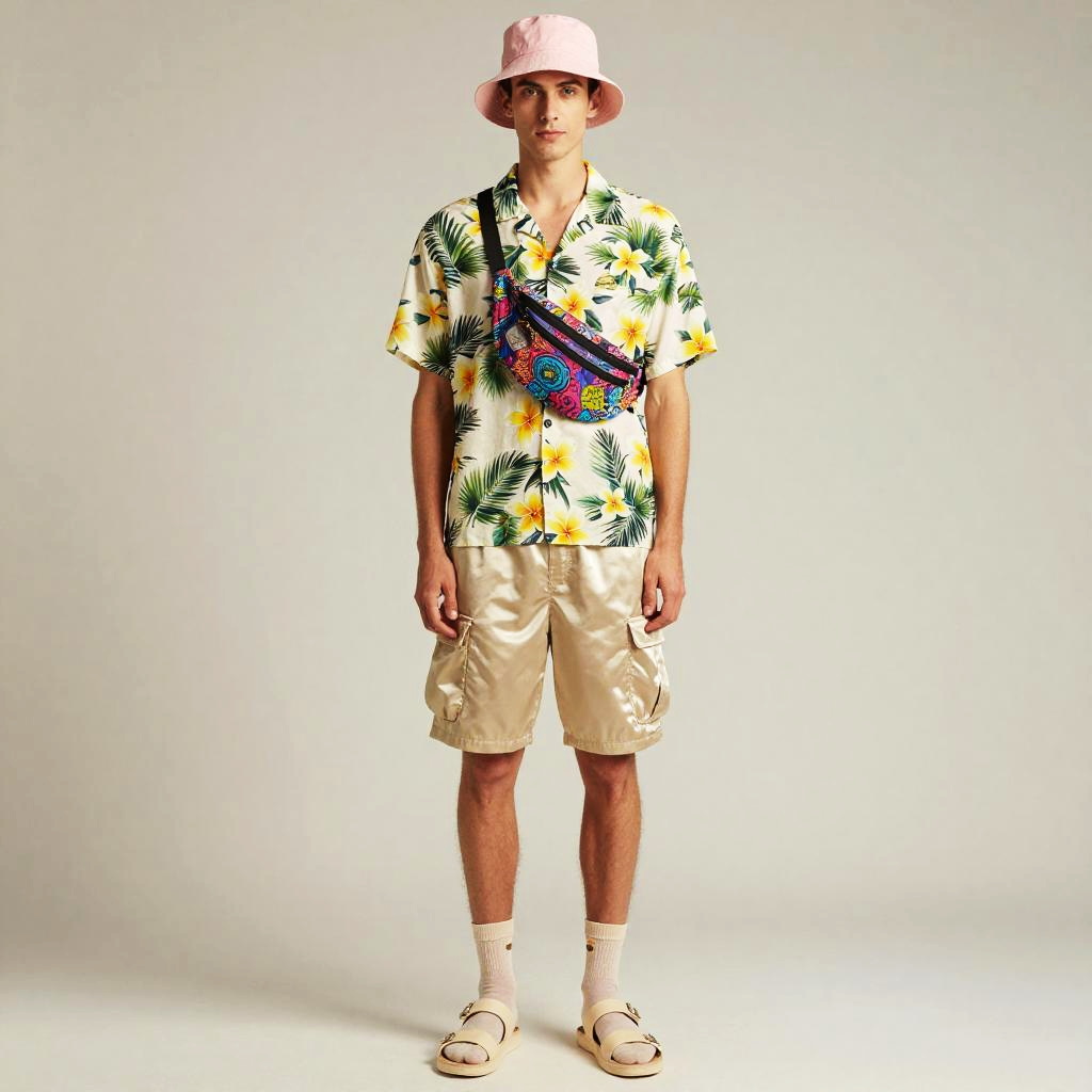 Elegant teenage boy, slicked back dark hair, slender physique, hawaii outfit, light patterned shirt, minimalist vector, smooth white studio background