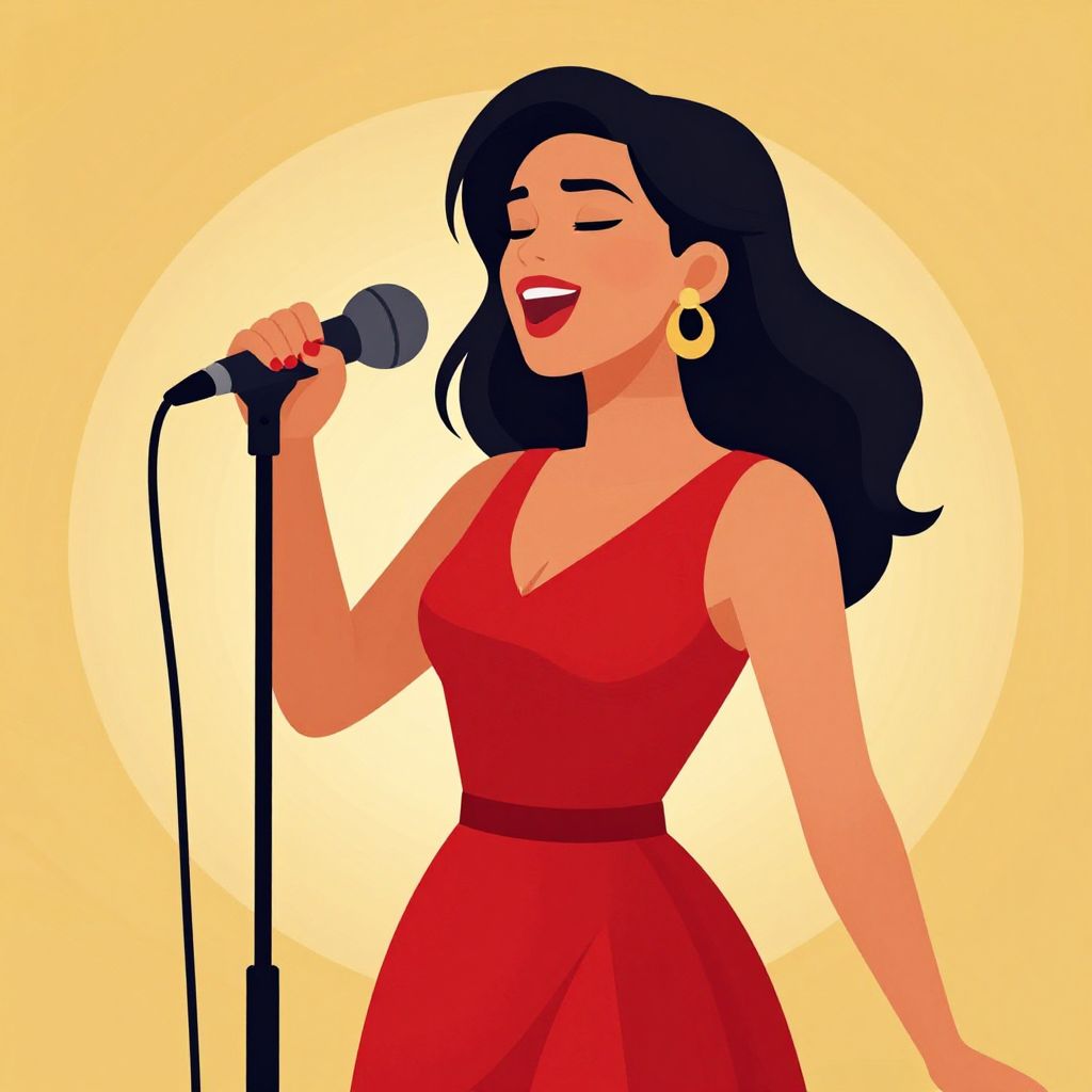 A vibrant vector illustration depicts a singing woman in a red dress, passionately performing into a classic microphone against a warm, golden-hued background with a retro aesthetic.