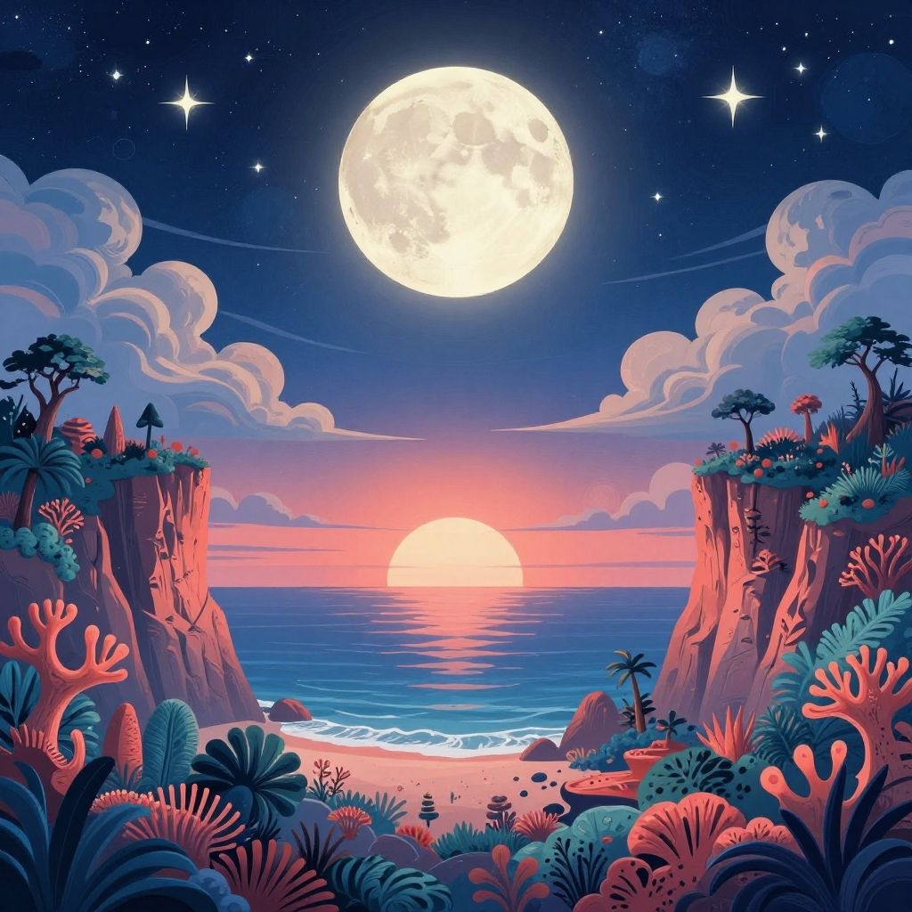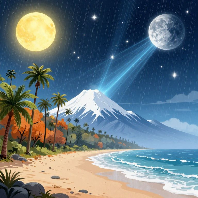 Digital illustration of a tropical beach at night. The foreground features a sandy shore with palm trees and autumn-colored foliage. Raindrops streak the dark blue sky, illuminated by a bright yellow full moon on the left and a glowing, detailed full moon on the right, with light beams shooting from it. A snow-capped mountain rises in the background, with a calm ocean to the right. The beach is dotted with rocks and the water has gentle waves. Stars are scattered in the sky, adding to the mystical atmosphere.