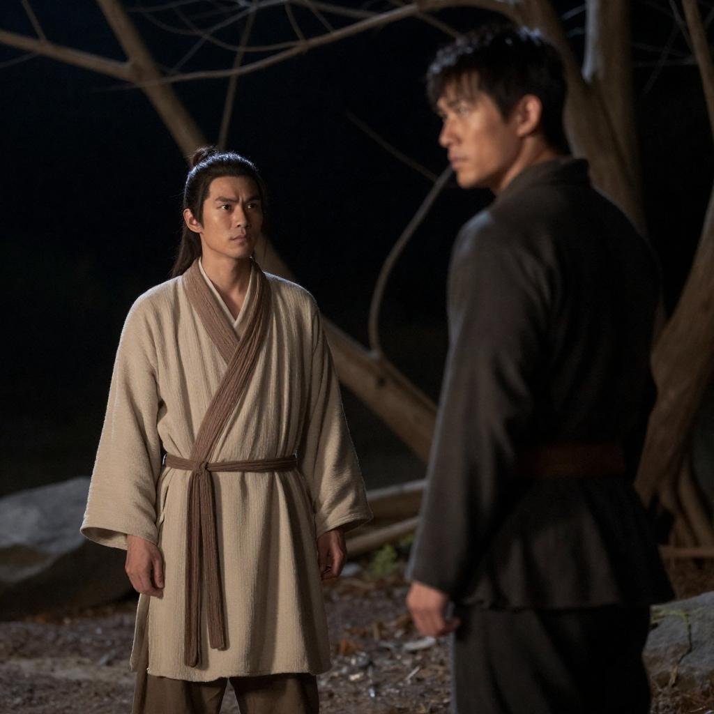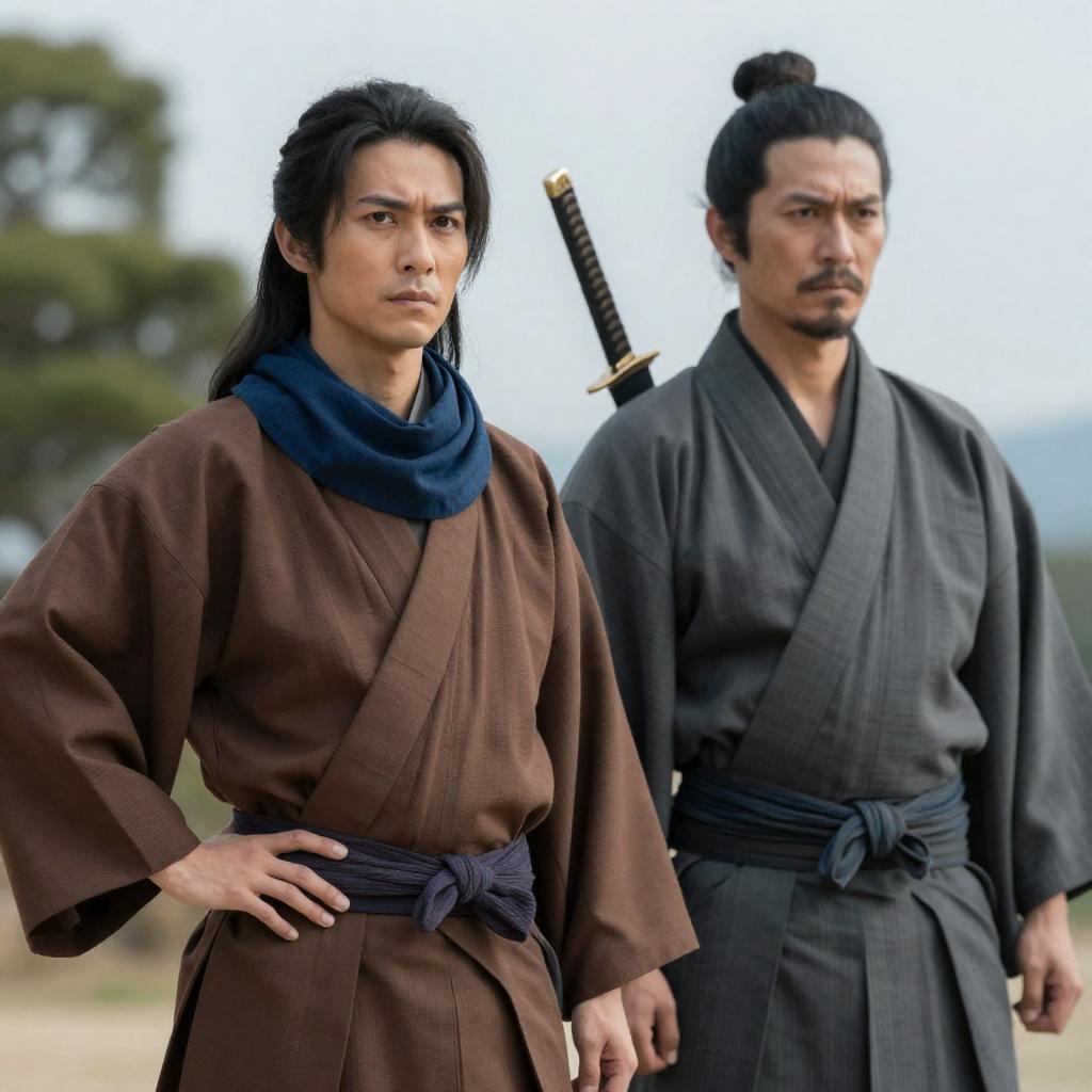 Photograph of two East Asian individuals standing side by side in a mountainous landscape. Both wear traditional, worn-out, dark clothing. The person on the left has dark, tousled hair, glasses, and a fur-lined robe with a quiver. The person on the right has black, tied-back hair, a brown robe, and holds a bow. Both look ahead with neutral expressions. Rolling hills with green and brown patches in the background.