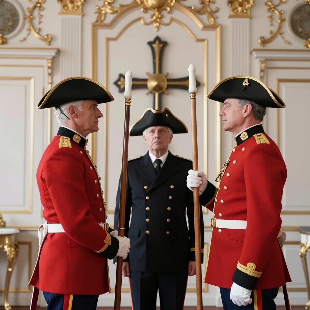 Five male soldiers in a row, wearing 18th-century British military uniforms with red coats, white waistcoats, and black tricorn hats. They have brown hair, white shirts, and brown sashes. Their faces are serious and focused. Background includes more soldiers in similar uniforms. Soldiers hold a metal railing.