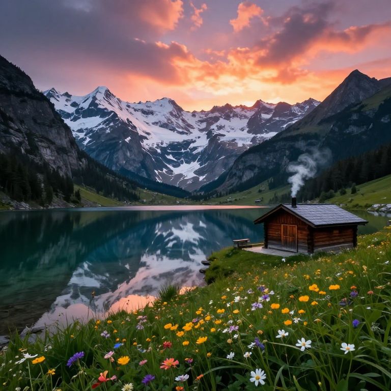 Photograph of a serene mountain lake at sunset, reflecting snow-capped peaks, with a wooden cabin emitting steam, surrounded by vibrant wildflowers.