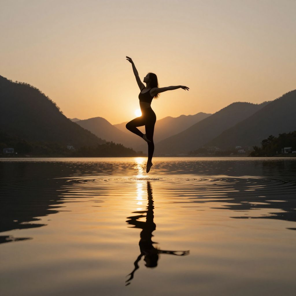 Silhouetted woman dancing on water at sunset, reflected in calm lake, surrounded by mountainous landscape, golden sky, serene and graceful.