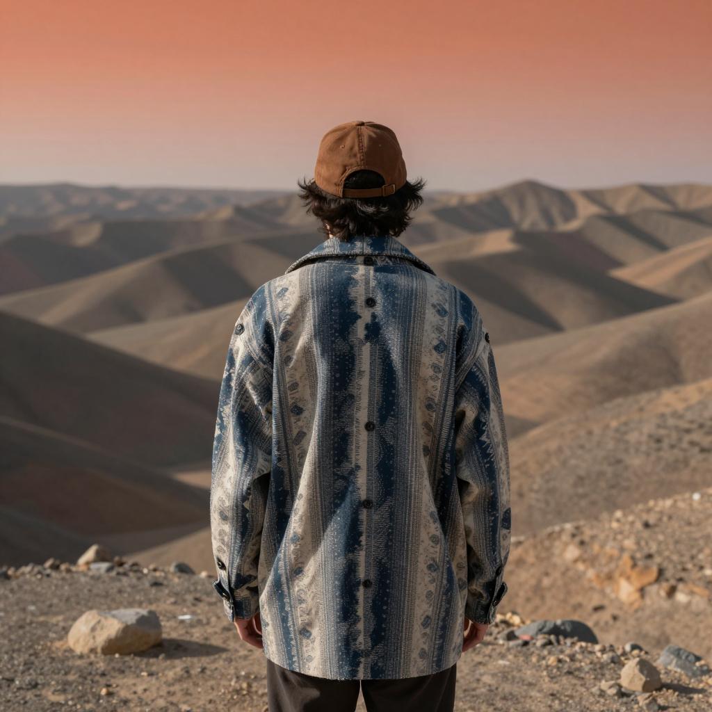 A young man wearing a red plaid shirt, brown pants, and a green cap sits on a rocky ledge with his hands clasped, looking down thoughtfully. The scene features an overcast sky with cloudy mountains partially covered in snow patches in the background, a calm pond to the left, and green shrubs surrounding the area, creating a moody and reflective atmosphere.