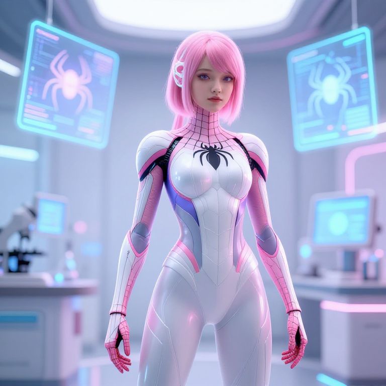 Pink and white spider girl standing confidently in a futuristic lab filled with holographic displays and spider motifs, sleek armor with organic and technological elements, environment glowing with soft pastel hues, blending sci-fi and fantasy aesthetics.