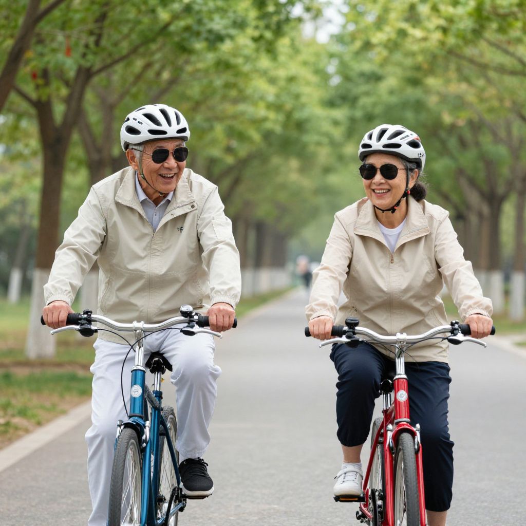 Two elderly individuals joyfully cycling side by side along a tree-lined path, both wearing sunglasses and coordinated beige jackets, with the man on a blue bicycle and the woman on a red one.