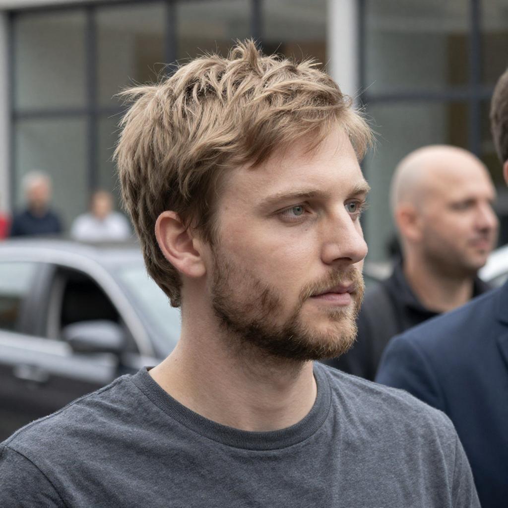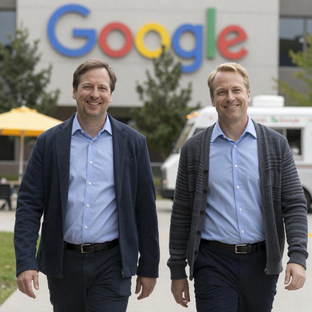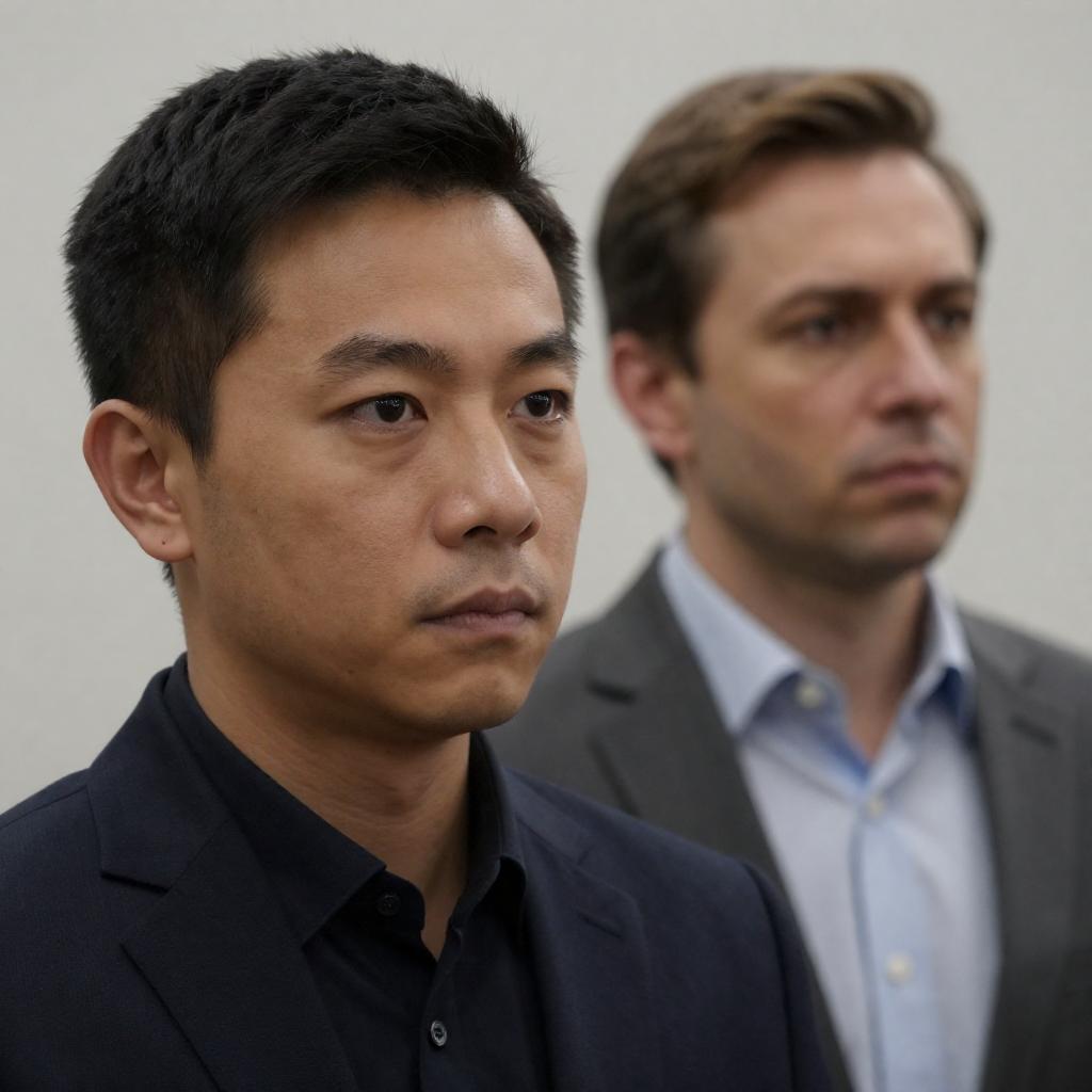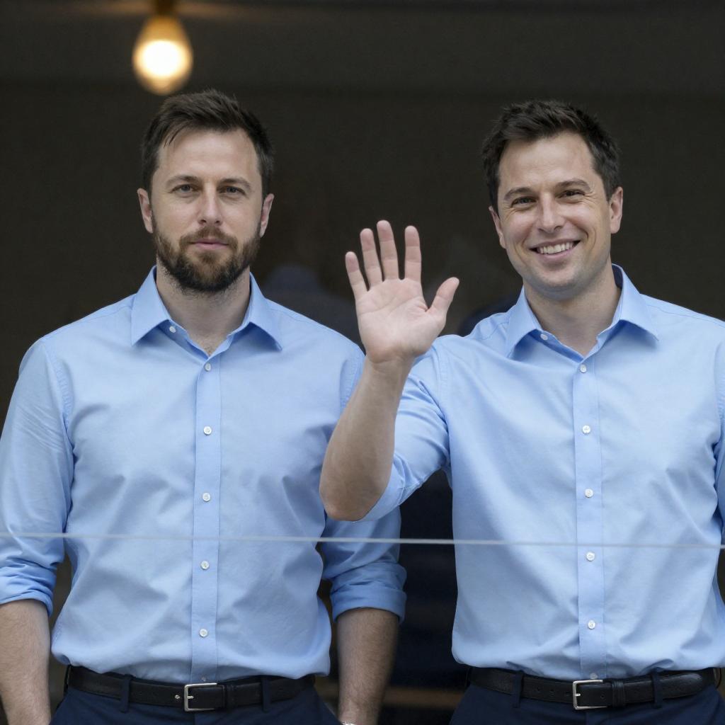 Photograph of two men standing side by side, both wearing light blue shirts. The man on the left has short brown hair, a slight beard, and a neutral expression. The man on the right has short brown hair, a broad smile, and is waving. Background includes blurred lights and reflections. Both men have light skin and are positioned behind a glass barrier.