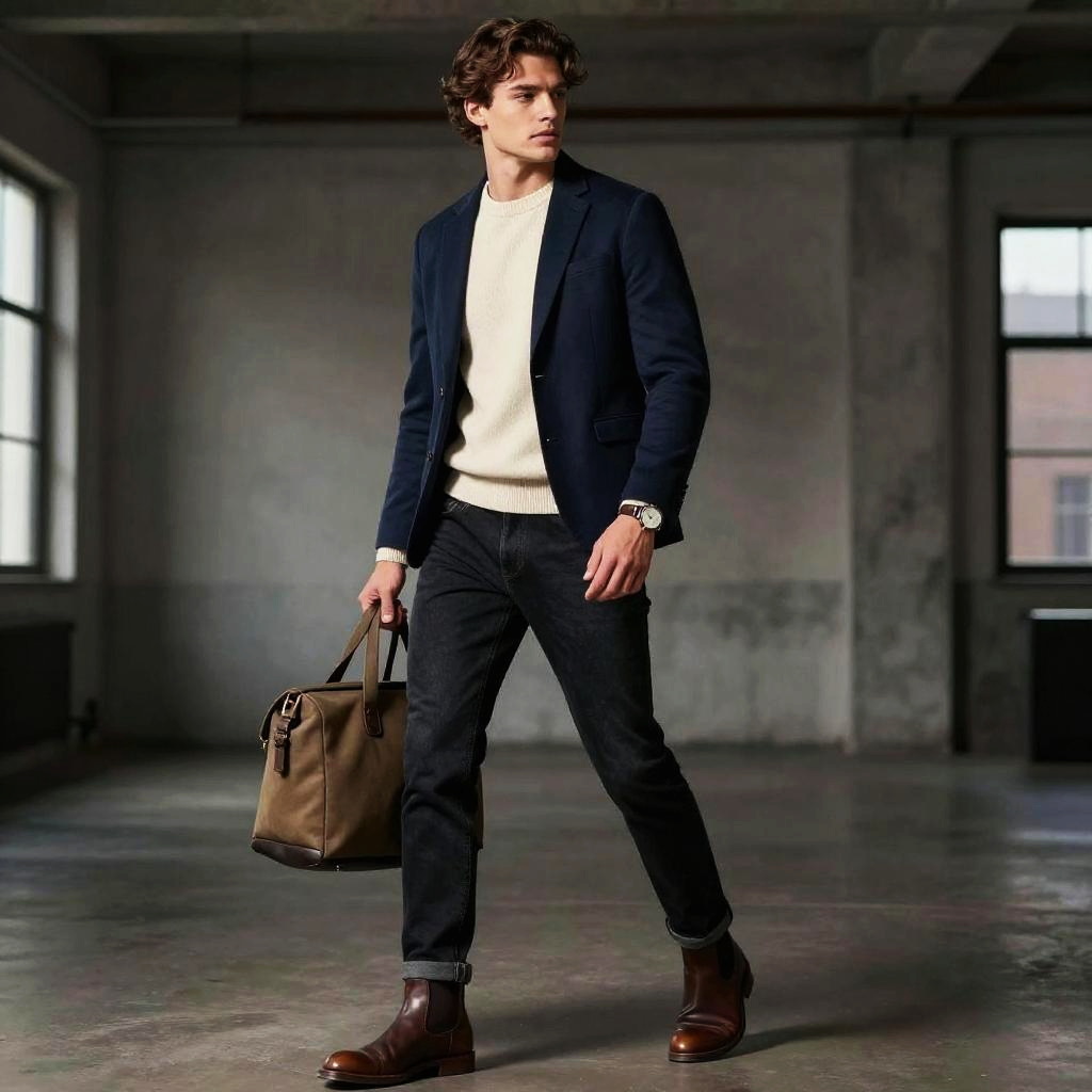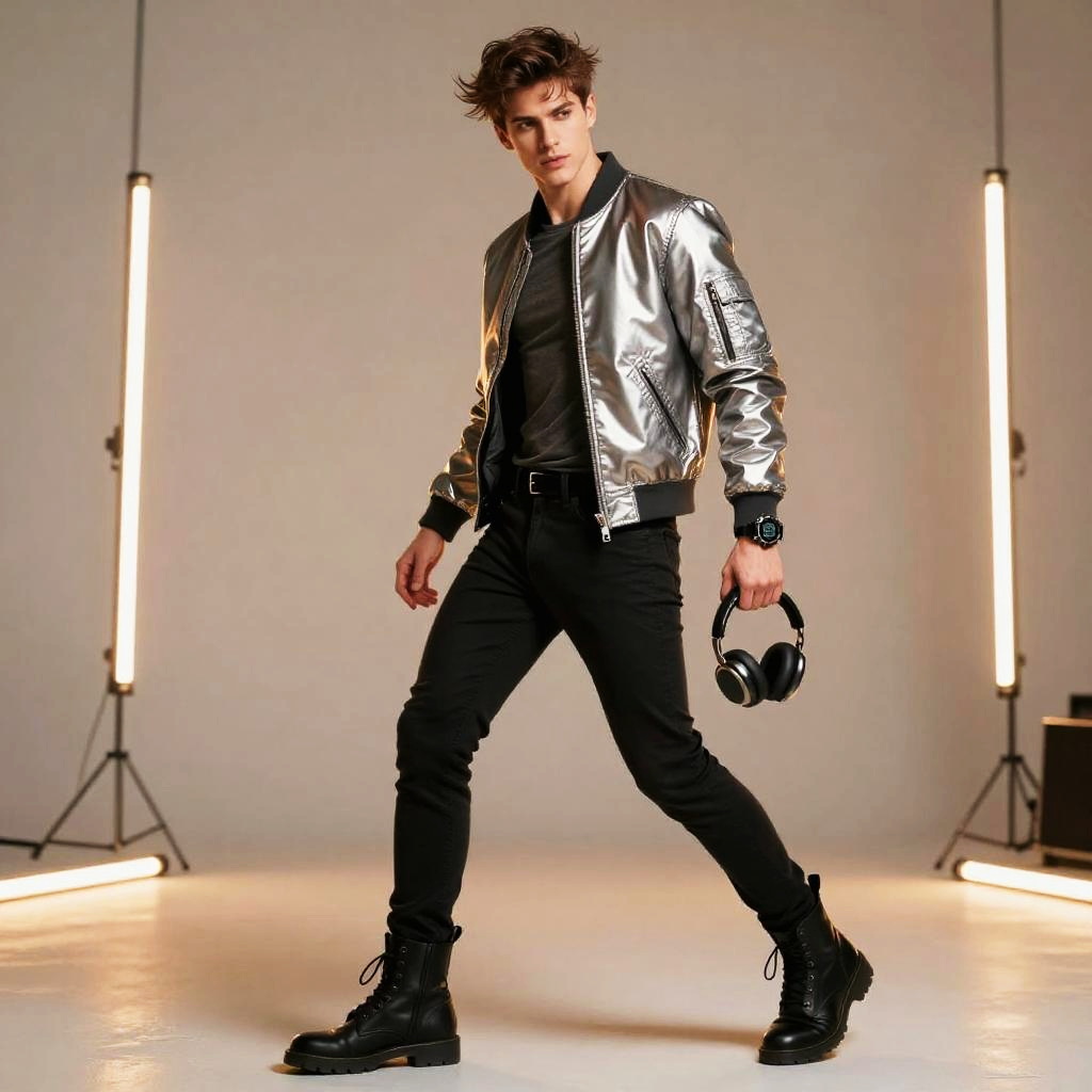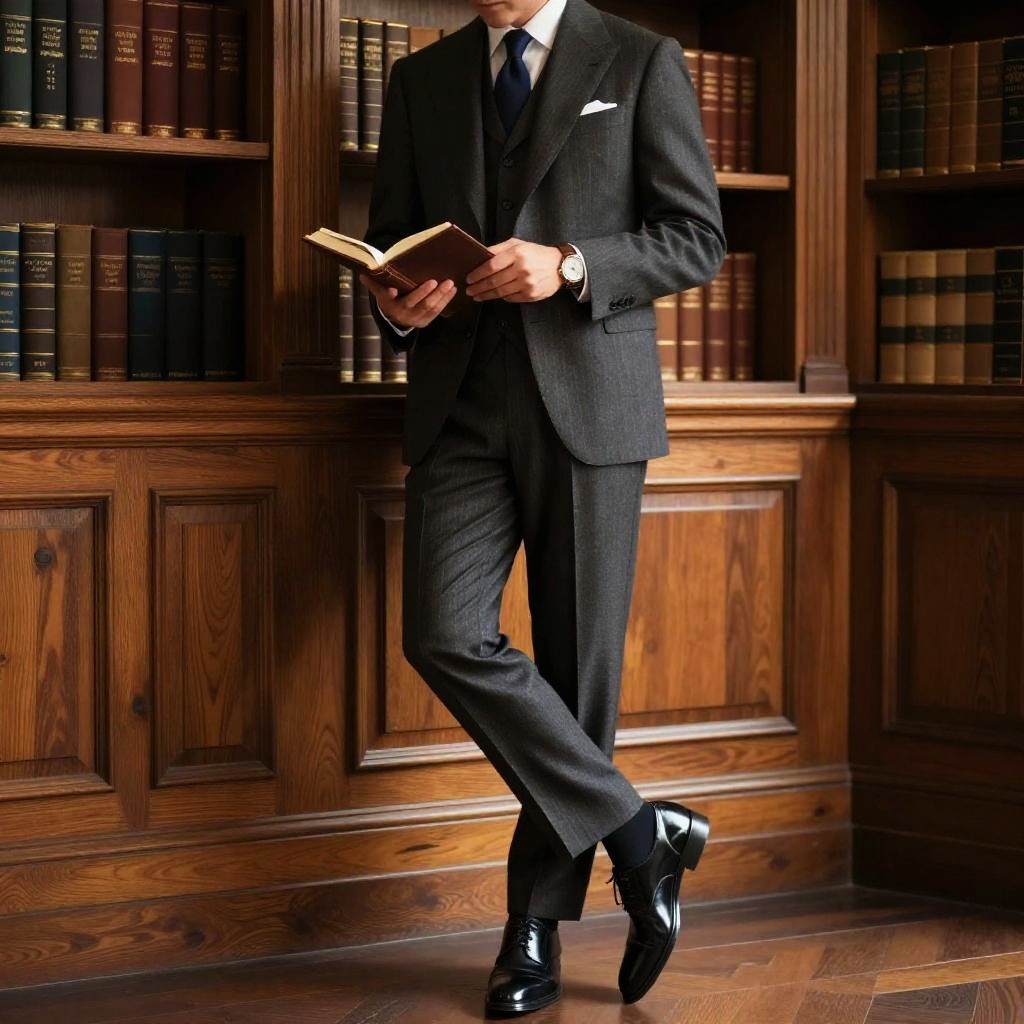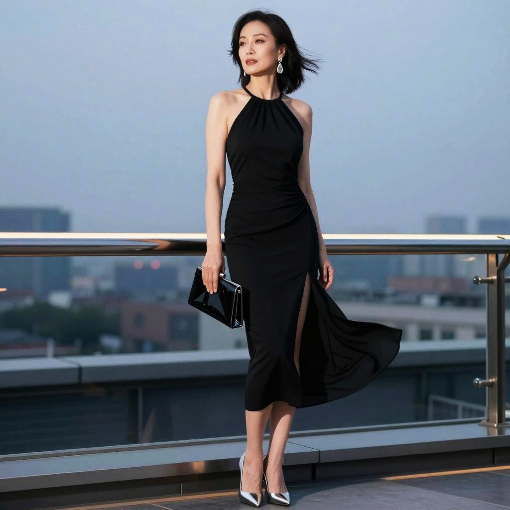 Stylish middle-aged woman, sleek corporate office with panoramic city views, sharp charcoal grey pantsuit with fitted blazer, white silk blouse underneath, layered gold necklaces, black pointed-toe pumps, minimalistic gold watch, holding a leather portfolio folder, cinematic composition, warm diffused key light with glossy reflections, fashion editorial photography, high detail fabric texture, shallow depth of field, soft shadows, crisp focus, dynamic pose, wind in fabric, atmospheric mood