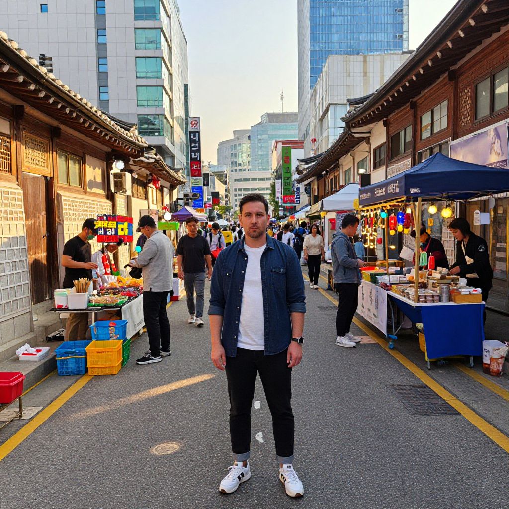 Captivating street scene: A man stands out amidst the vibrant energy of Seoul's bustling streets, surrounded by a blend of traditional hanok buildings, modern skyscrapers, neon signs, and colorful street vendors. The warm sunlight casts long shadows across the pavement, illuminating the diverse urban landscape. His casual attire blends seamlessly with the eclectic surroundings, Man has masculine face and piercing eyes