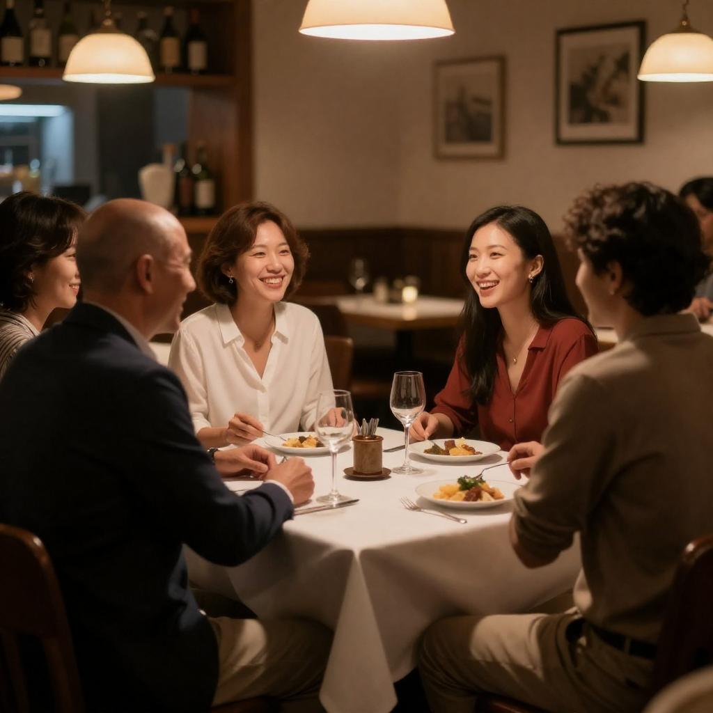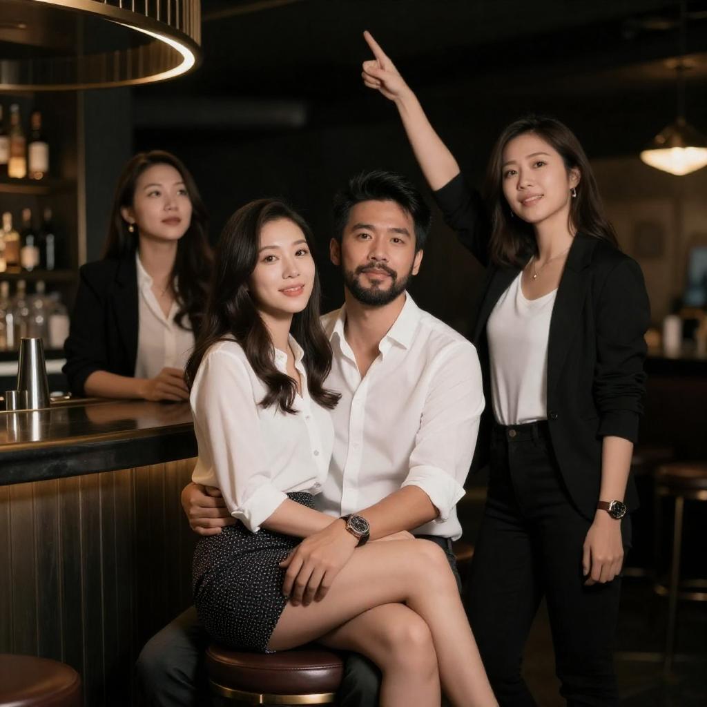 Photograph of four Asian individuals in a dimly lit, modern bar. A man with a beard and white shirt sits with a woman in a white top and black patterned skirt on his lap. Another woman in a white top and black jacket stands to the right, pointing upward. A woman in a white blouse and black jacket sits at a curved bar counter in the background.