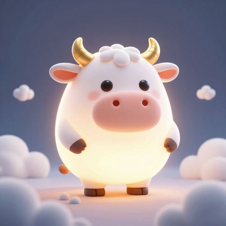 Glowing cow stands serenely atop fluffy white clouds, its body radiating a warm, luminous aura against a serene teal backdrop.