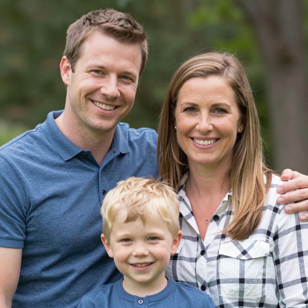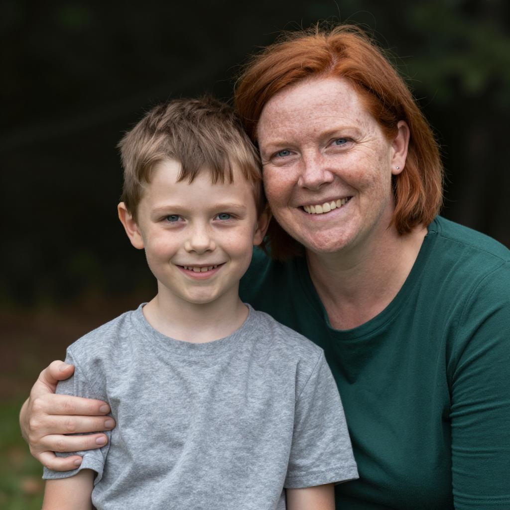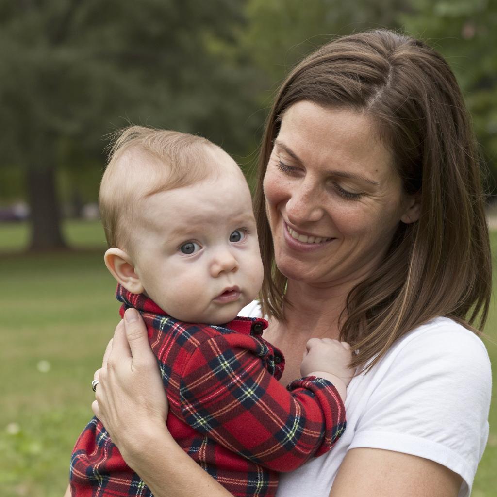 Portrait of a smiling Caucasian woman with shoulder-length brown hair wearing a white shirt, holding a baby with light brown hair dressed in a red plaid shirt. The background features green trees and grass in a park setting.