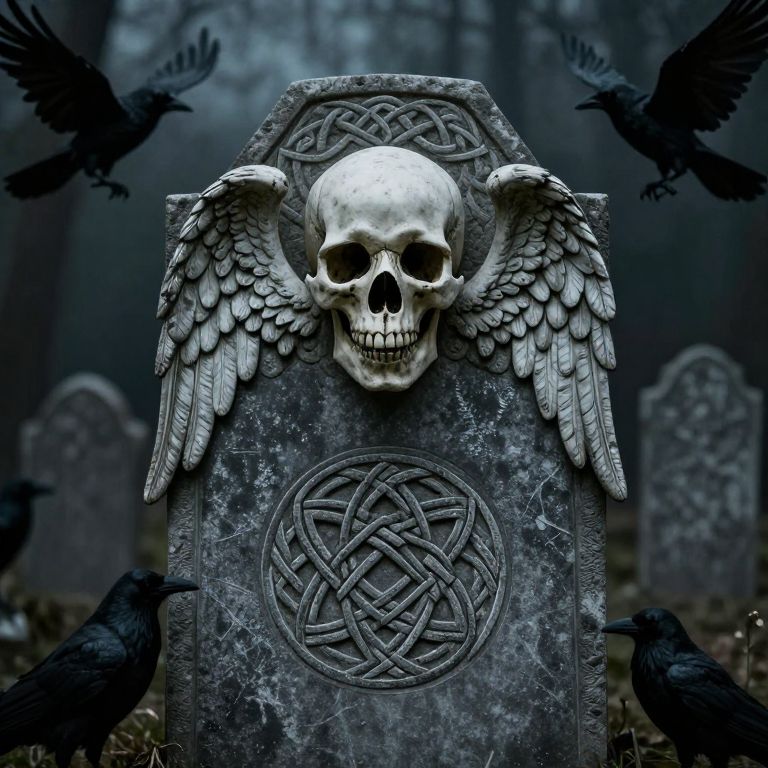 A skull with wings and a Celtic knot on a tombstone, surrounded by crows and a dark, eerie background.