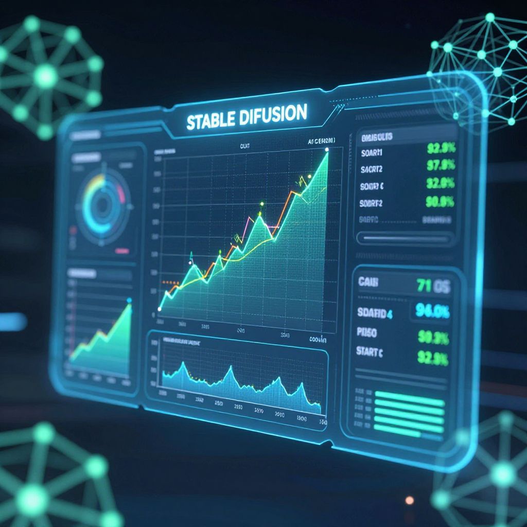Visualize stable diffusion cost per image as a high-tech dashboard with holographic graphs displaying cost breakdowns and AI model statistics, surrounded by abstract neural network visuals, glowing blue and green tones creating a sci-fi atmosphere.
