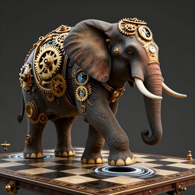 A steampunk-inspired 3D render depicts a majestic elephant adorned with intricate golden gears and mechanical components, its eyes replaced by clockwork mechanisms, as it strides across a floating chessboard, each deliberate step creating ripples of temporal paradoxes beneath its feet.