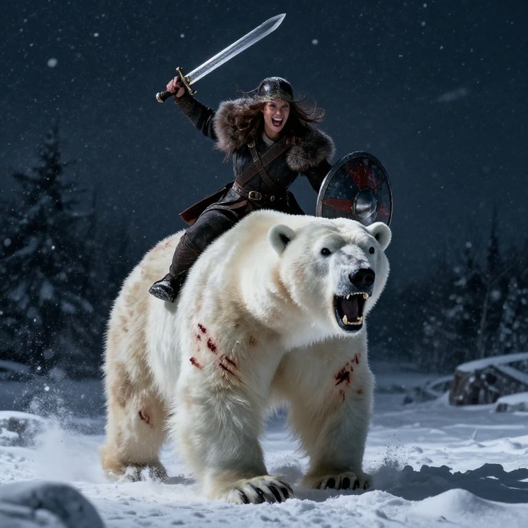 Image is a digital artwork depicting a dramatic scene in a snowy forest, The layout is dynamic, with a massive, realistic bear dominating the left side of the frame, The bear has a thick, shaggy brown coat, sharp claws, and an open mouth displaying large teeth, conveying a sense of power and aggression, On the right, a human figure stands facing the bear, holding an axe in one hand and a bow slung over their back, The person is dressed in a warrior-like outfit with a red cape and armor, suggesting a fantasy or mythological theme, Snowflakes are visible in the air, adding to the cold, tense atmosphere, The lighting is dramatic, with shadows and highlights emphasizing the textures of the bear's fur and the warrior's attire