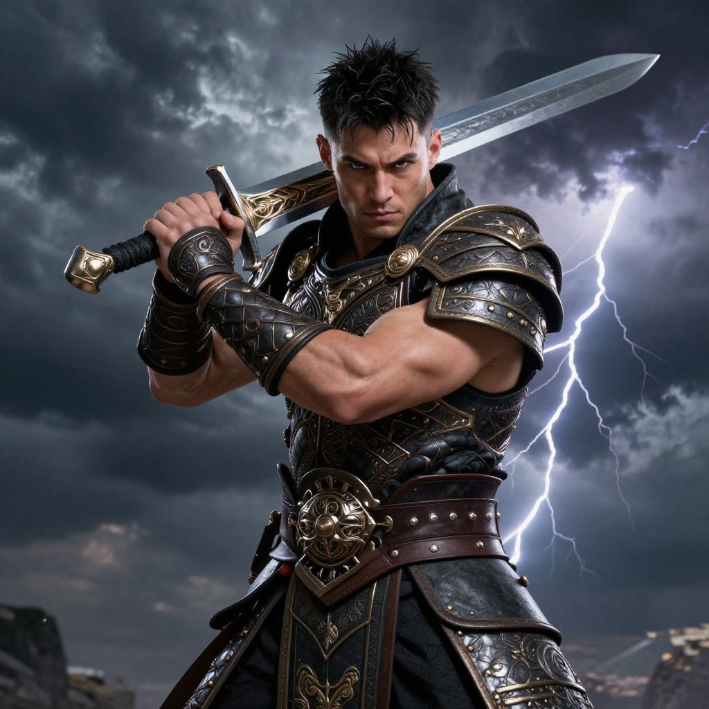 Photograph of a muscular, dark-haired man in shiny, star-emblazoned Roman-style armor holding a trident, standing in a smoky