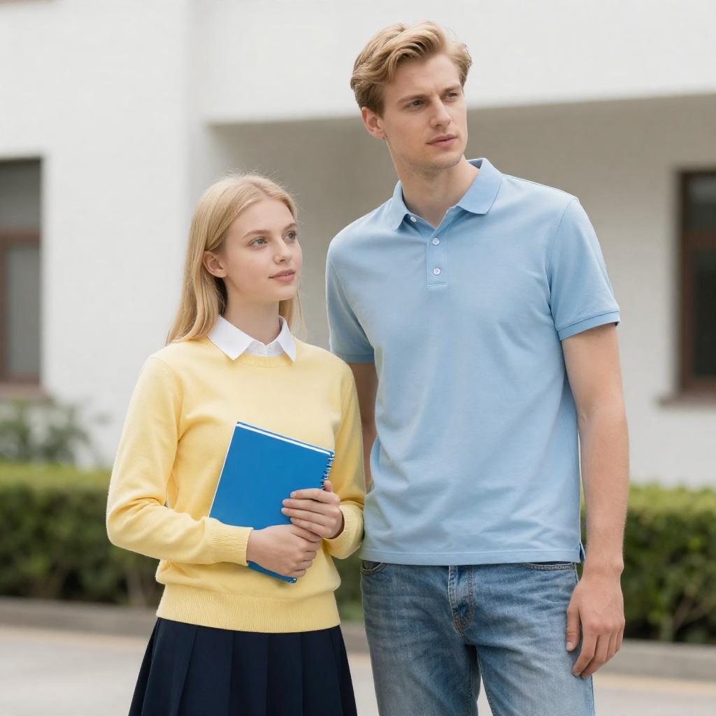 Photograph of three people standing in a store aisle. A blonde woman with long hair, wearing a white top and blue vest, stands in the center. Flanking her are two men with short hair; the left man has light hair and wears a white shirt and blue vest, while the right man has dark hair and wears a gray t-shirt and blue vest. Shelves filled with products are in the background.