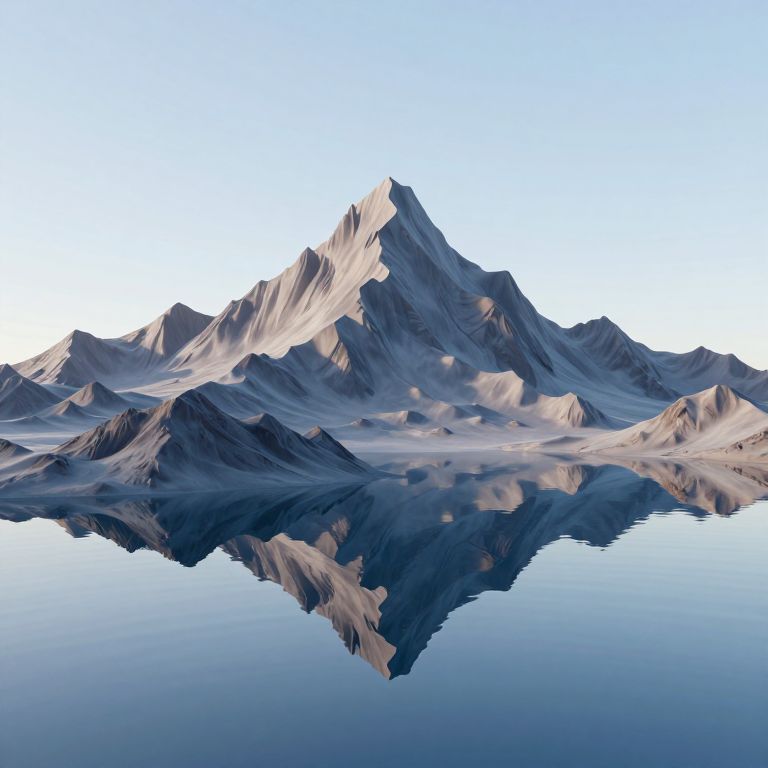 A surreal 3D-rendered landscape depicts mountains with inverted peaks, where their summits sink into the earth while their bases rise toward the sky, creating a mirrored reflection on the tranquil water below, evoking a dreamlike, high-definition visual effect.