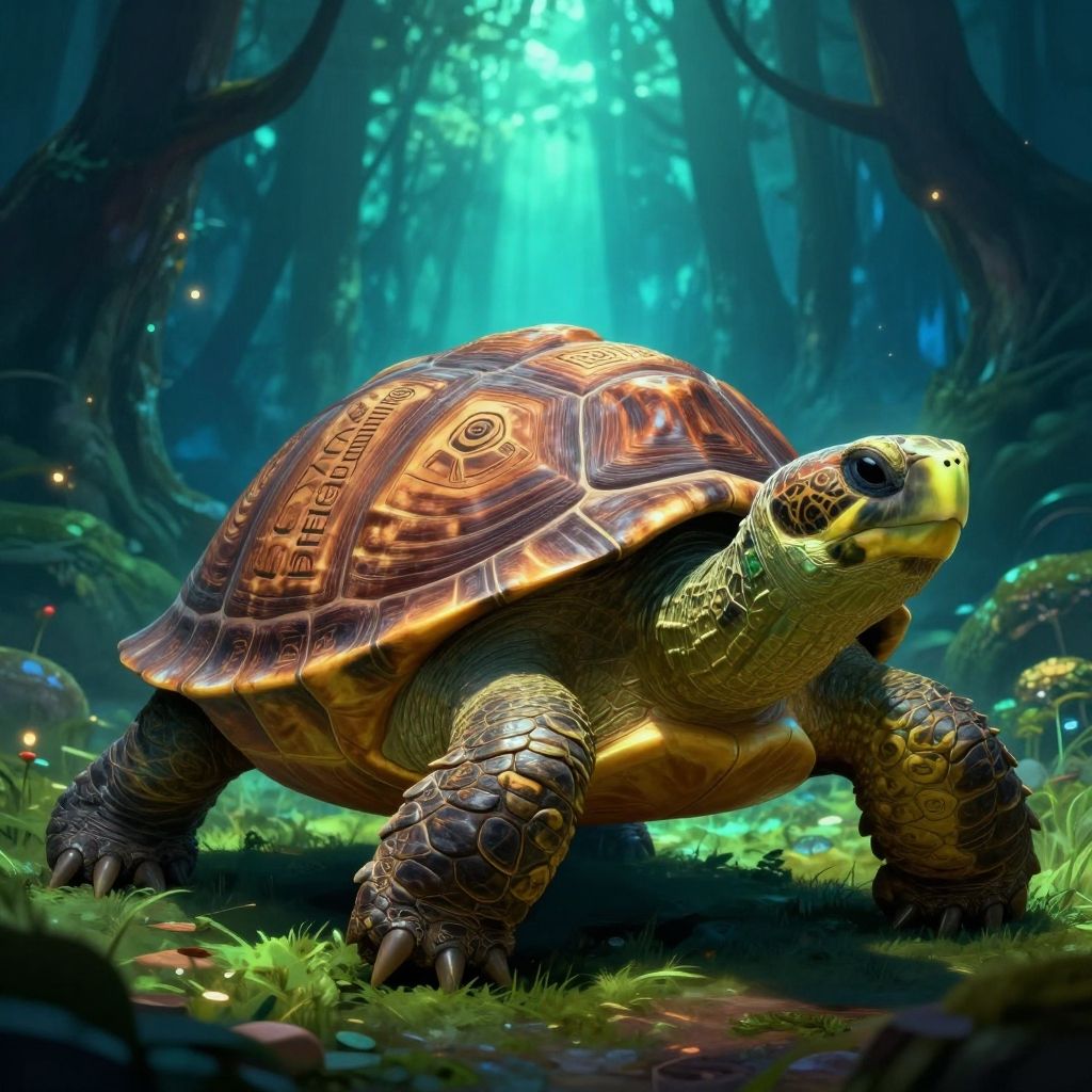 Turtle in Neverending Story, majestic giant turtle with ancient runes on shell, mystical forest background, glowing light, fantasy illustration, highly detailed, vibrant colors