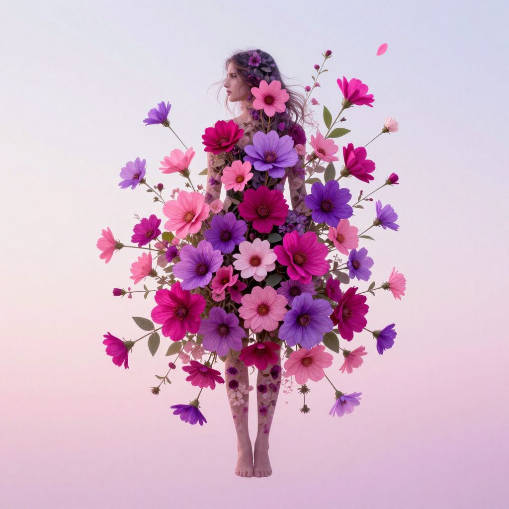 This is a digital illustration of a woman with long, wavy hair, partially obscured by a vibrant bouquet of large, colorful flowers. The flowers, in shades of pink, purple, magenta, and blue, surround her body and extend outward. Her skin is pale, almost white, and she is standing barefoot against a gradient background that transitions from white to light pink. The flowers are detailed with visible petals and green stems, creating a lush, textured appearance. The woman’s silhouette is subtle, blending with the floral arrangement, emphasizing the vivid colors of the flowers. The overall style is surreal and dreamlike.