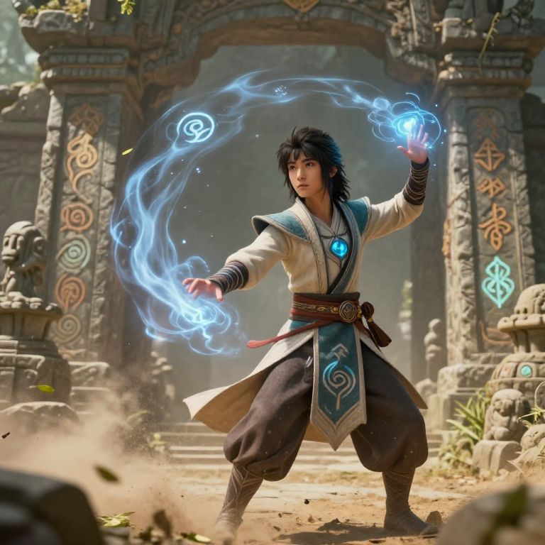 Digital art of an Asian male mage in a temple, wielding blue magical energy circles, wearing a white and blue robe, standing in a stone archway