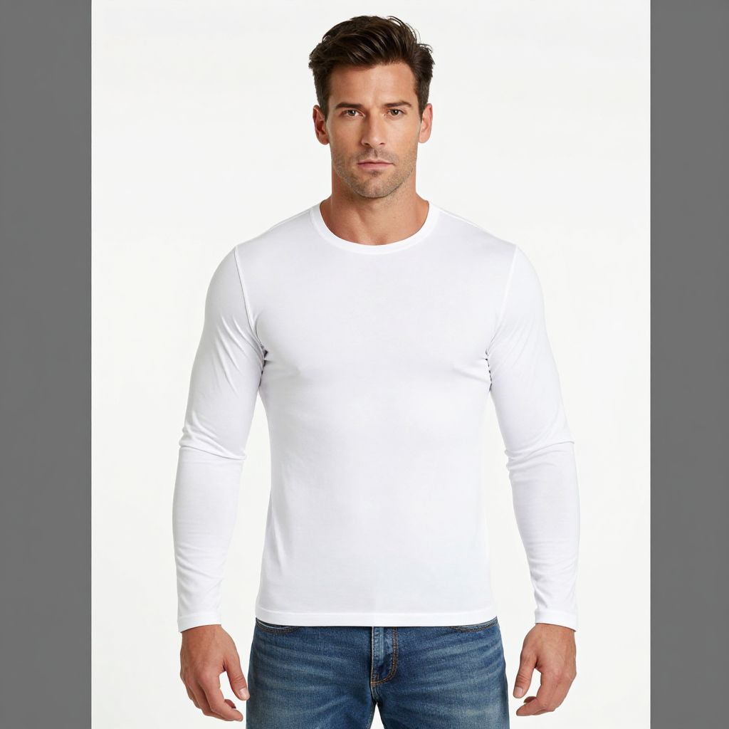 Photograph of a Caucasian man with short, dark brown hair and a clean-shaven face, standing against a plain white background. He has a fit, muscular build and is wearing a simple, long-sleeved white shirt that fits snugly, and blue jeans. His expression is neutral, with a slight gaze to the side. The image is sharply focused, with the man centered and his arms relaxed at his sides. The overall lighting is even, highlighting his features and clothing. The background is entirely white, creating a stark contrast with the man and his clothing.
