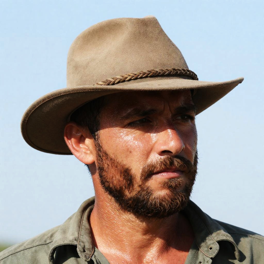 Photograph of a rugged, middle-aged man with a brown beard, sweat on his face, and a slightly weary expression. He wears a tan hat with a braided band and a green shirt. Clear blue sky background. Close-up, slightly angled from below.