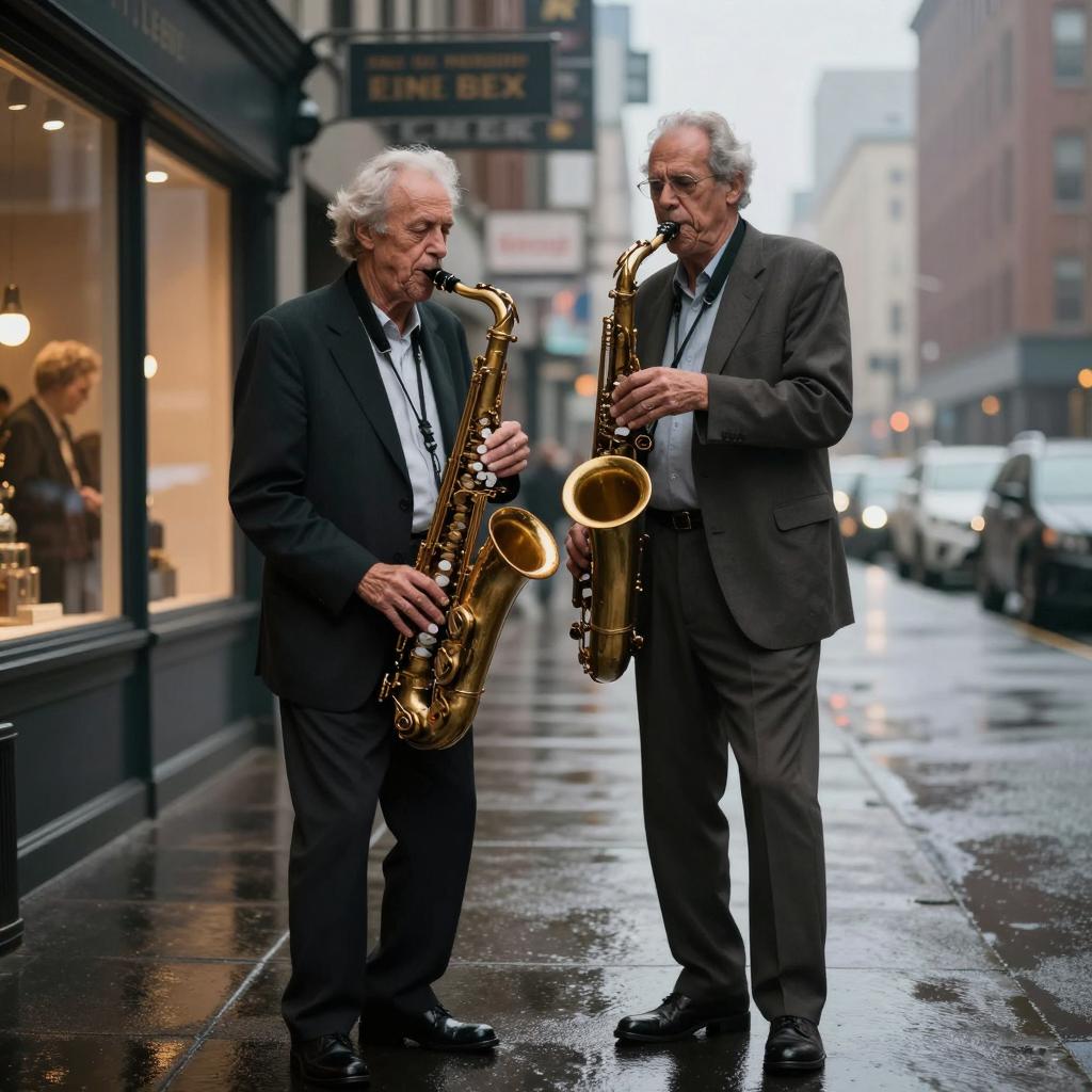 Friendship full body photography of a elderly jazz saxophonist in a rainy downtown street with illuminated shop windows under dramatic cinematic lighting, Photorealistic high quality, Cinematic ultra detail CGI, VFX, 85mm lens, F/1.4, Shutter Speed 1/60, shallow DOF, volumetric haze, HDR, RTX ray tracing, screen-space reflections, global illumination, film grain, post-production
