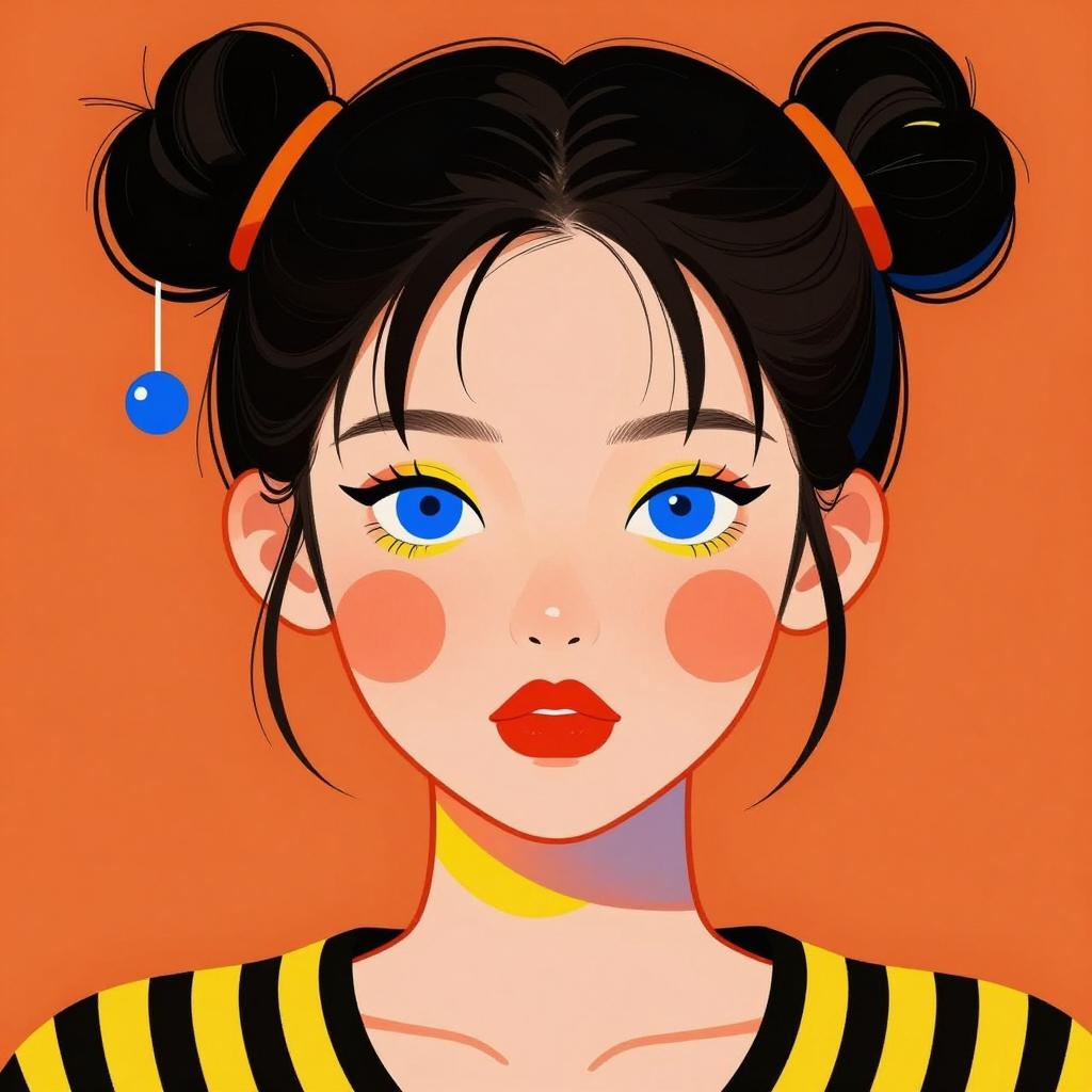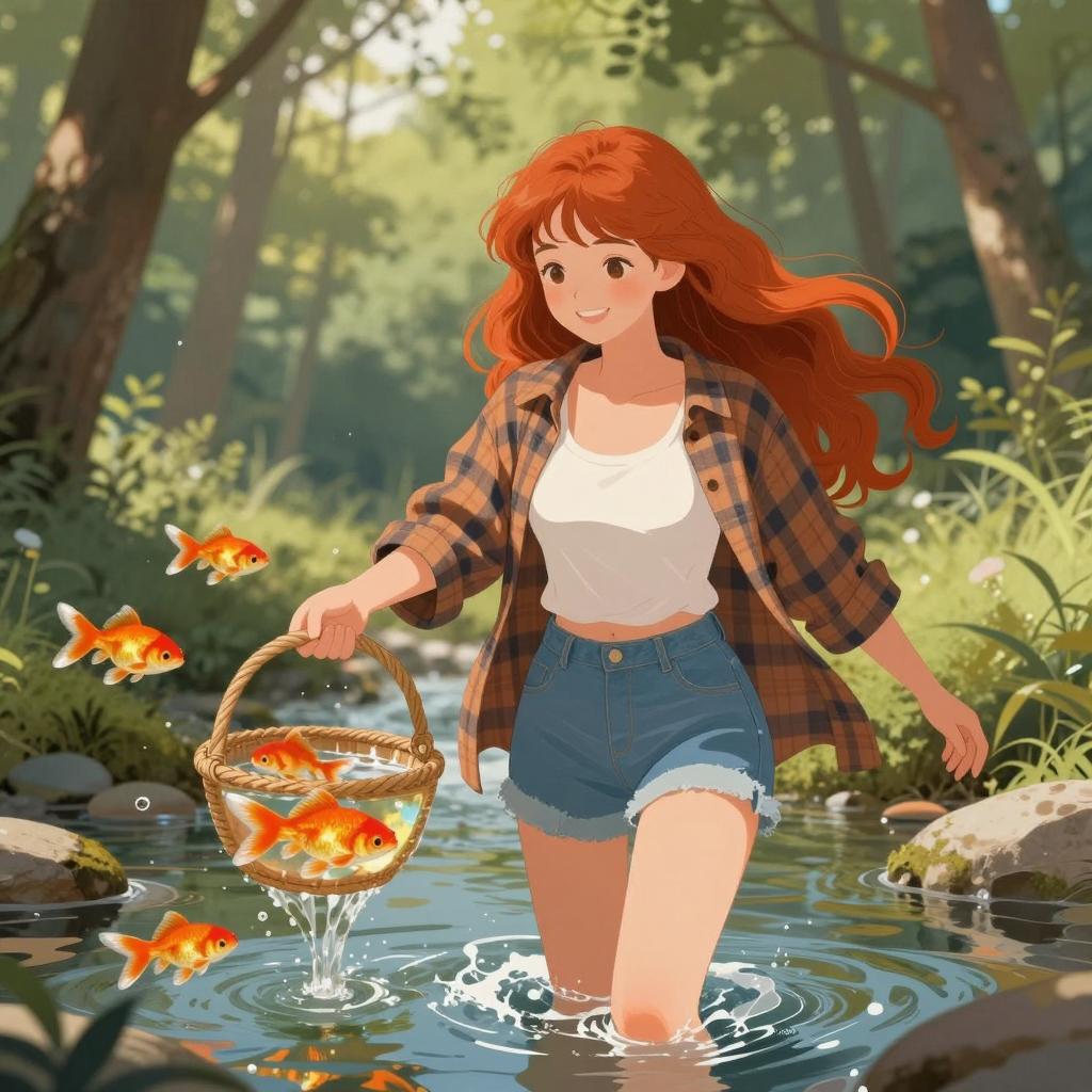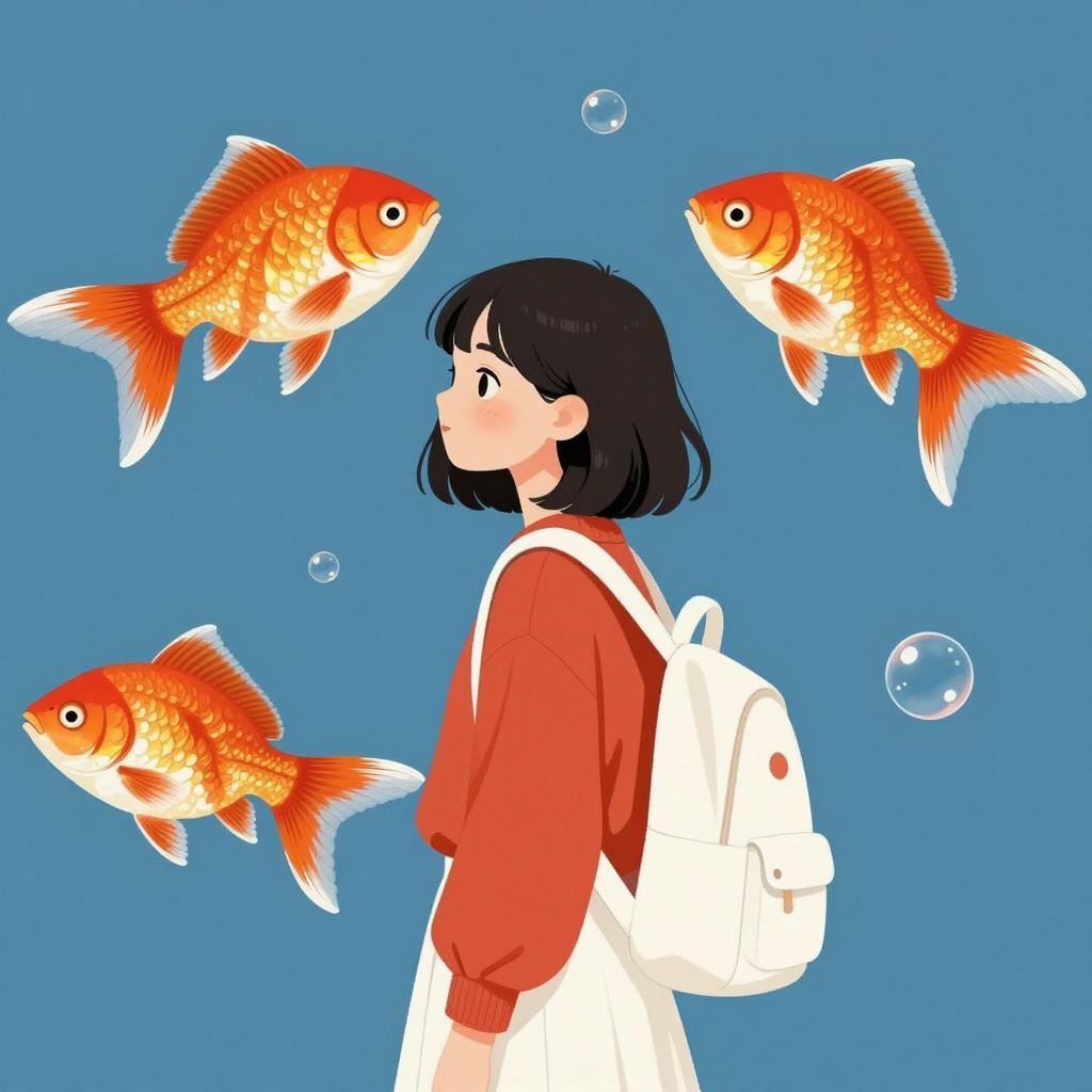 Digital illustration of a young woman with short black hair, red long-sleeve top, white pleated skirt, and white backpack. She is surrounded by three large orange and white fish in a blue background. Bubbles are scattered around. She is seen in profile, looking to the left. The fish are above and beside her, swimming.