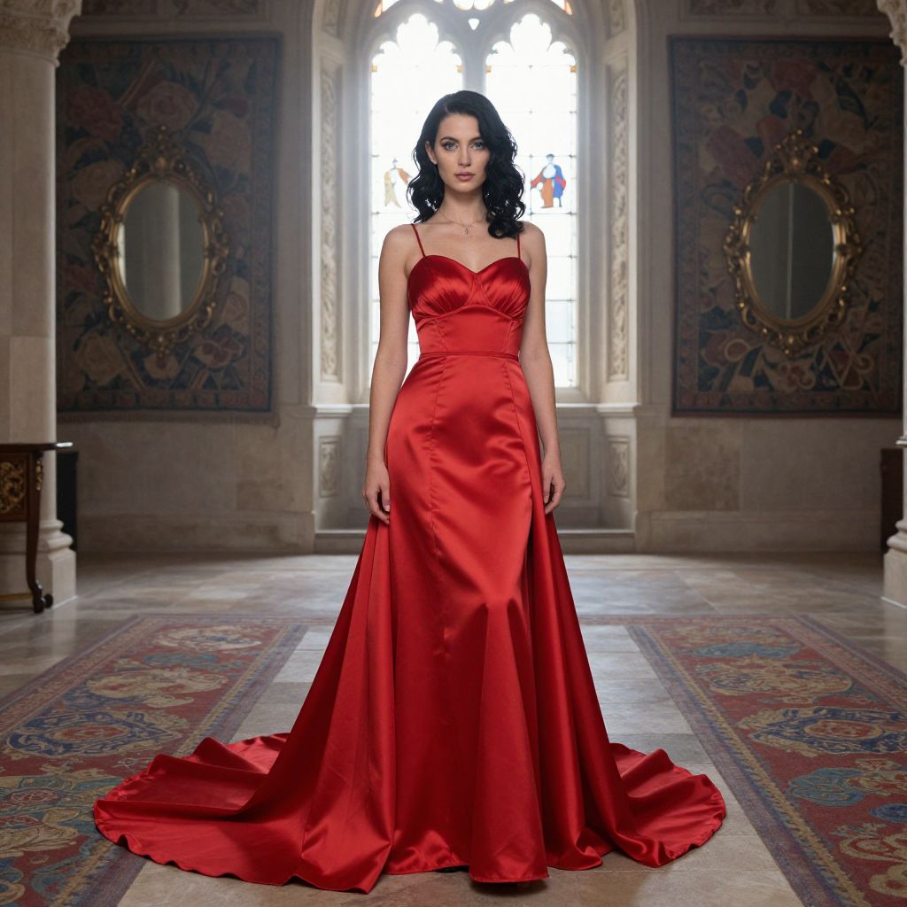 A cinematic portrait of a strong, confident bride-to-be in her early twenties with dark wavy hair and sharp aqua-blue eyes, wearing a lavish crimson costumed bridal maid dress with a structured bodice and flowing train, standing in a grand, foggy castle hall with tapestries and antique mirrors, the dress glistening with soft morning light filtering through tall stained glass windows.