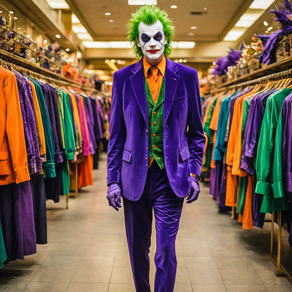 Portrait of a broad-shouldered man wearing a purple velvet suit with a green silk vest and an orange bamboo fabric shirt. He has short spiky purple hair and is wearing clown makeup in a chaotic, villainous style. The man stands in a brightly lit shopping mall aisle, surrounded by racks of colorful clothing.