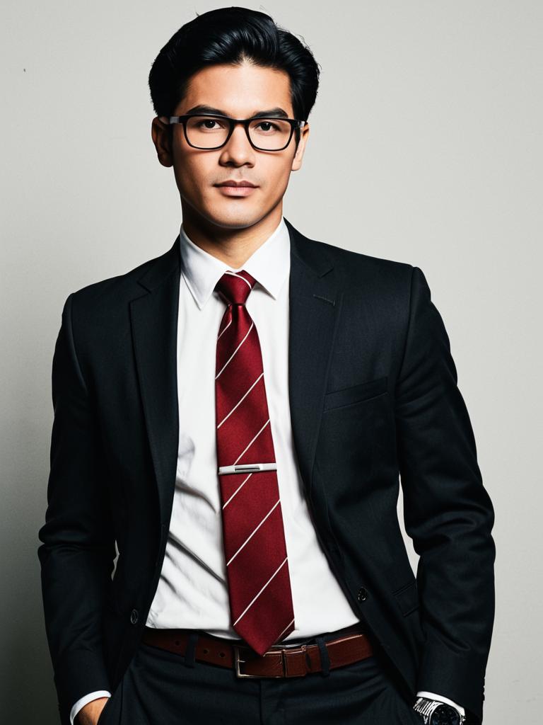 Man business professional, 1boy, male focus, solo, necktie, hand in pocket, glasses, belt, shirt, jacket, pants, suit, formal, black hair, white shirt, black pants, collared shirt, red necktie, standing, looking at viewer, black jacket, realistic, wristwatch
