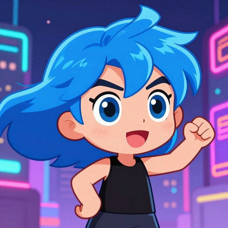 Blue hair cartoon character with vibrant electric blue locks flowing in the wind, set against a neon cityscape backdrop, expressive big eyes, dynamic pose, cel-shaded style, playful and energetic atmosphere, bold outlines, and bright colors.