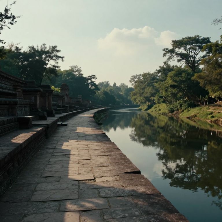 Suspended between sky and earth, this ethereal realm whispers of timeless serenity, where ancient stone paths guide the soul through a labyrinth of light and shadow, inviting contemplation amidst the quiet hum of nature and the gentle flow of a mirrored river below.
