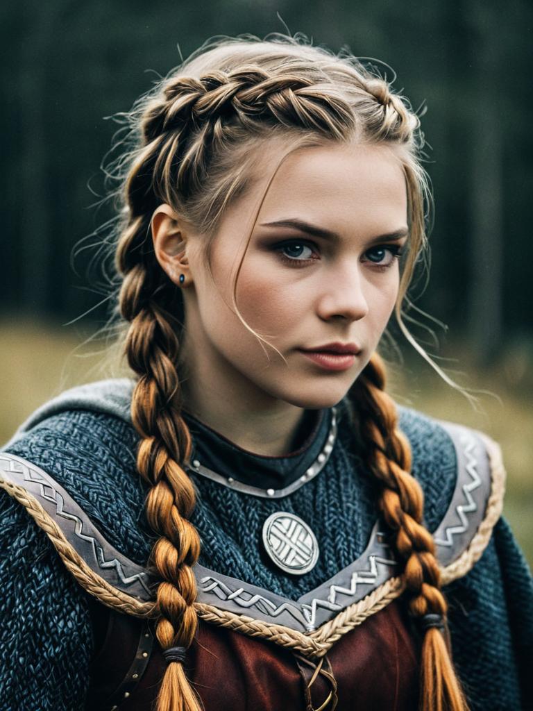 Woman in Viking Braids costume, cosplay editorial portrait, photorealistic tones