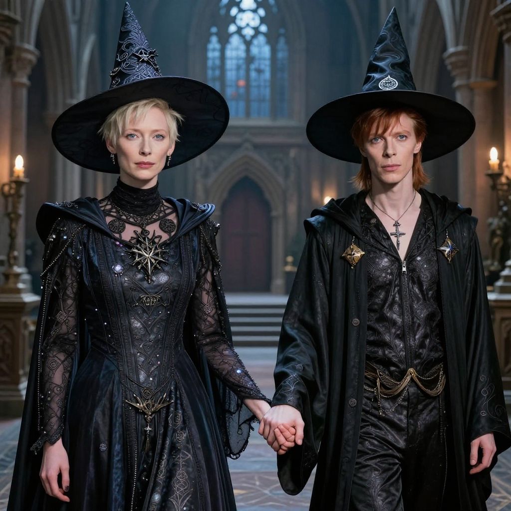 2 person holding hand, masterpiece, ultra realistic, professional photography, intricate details, young beautiful Tilda Swinton, young beautiful David Bowie, in witch wizard magical ornament robes, intricate witch hat, magical academy background, wide angle, soft dim natural lighting, magical