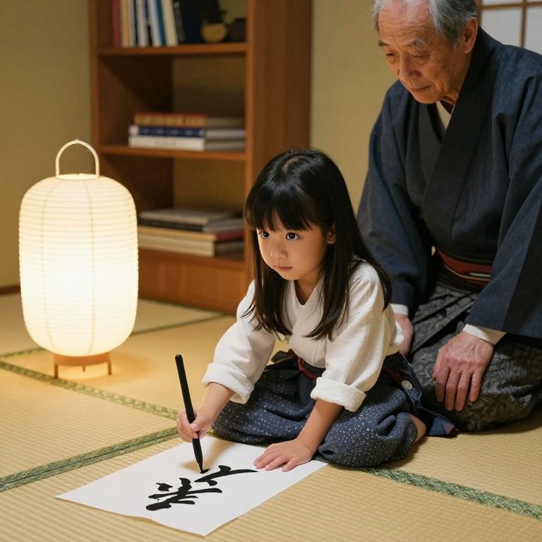 A cinematic portrait of a young apprentice girl with long black hair and bright, curious eyes, learning Japanese calligraphy from an elder teacher in a humble family home in Kyoto, both seated on tatami mats, the girl copying a graceful script on rice paper under the soft glow of a paper lantern, with traditional tatami flooring and a wooden shelf behind them.