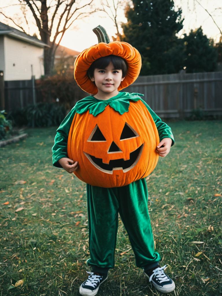 Youth Pumpkin Costume, young boy wearing a pumpkin costume standing in the yard --sref 1390